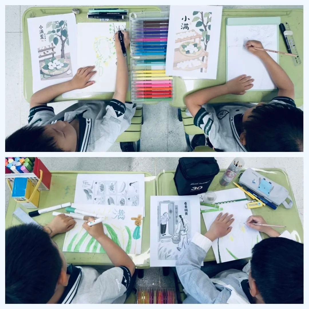 南师附中雨花台学校小学部围绕“小满”节气开展系列文化实践活动。各班级精心布置“小满节气”主题文化角,从节气起源、发展脉络到习俗及现实意义,图文并茂地展现传统农耕智慧。美术课堂上,教师带领学生描绘麦田丰收、蚕茧抽丝等小满图景,以画笔感知节气与农作的紧密联结。节气系列活动让学生在多元体验中亲近传统文化,于细微处播撒热爱民族文化的种子。