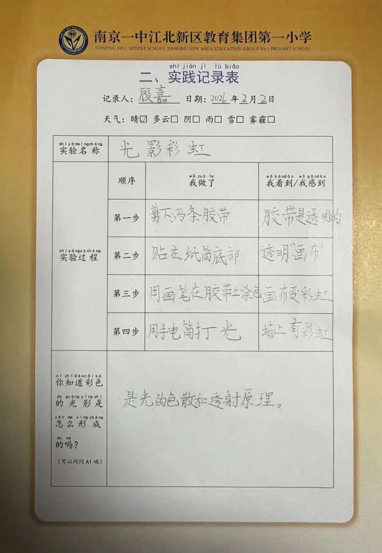 当新春的脚步悄然临近,当科学的光芒邂逅传统文化,“白驹乘光焕新春——‘光’探中国年家庭实验室项目化学习”学程周活动圆满落幕!这场沉浸式探索之旅,以“光”为核心密码,串联起实验探究、创意创作与新年温情,让小飞侠们在动手实践中解锁科学奥秘,在奇思妙想中传递新春祝福,每一个环节都充满惊喜,每一份成长都闪耀光芒。