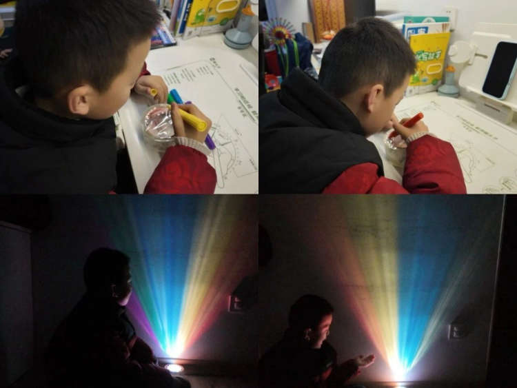 “影子画家”居然能画出彩色作品?一年级的“光影魔法师”们带着这个奇妙的疑问,走进了充满童趣的光影实验室。油性马克笔、宽胶带和手电筒,在小飞侠手中变成了神奇的“魔法道具”,当光束穿透胶带,墙上投射出一道灵动的彩虹光影。“彩色光影是怎么来的?”“不同颜色的光影重叠会变成什么样子?”带着这些疑问,他们或是请教爸爸妈妈,或是借助AI工具寻找答案,小小的脑袋里装满了对科学的好奇。