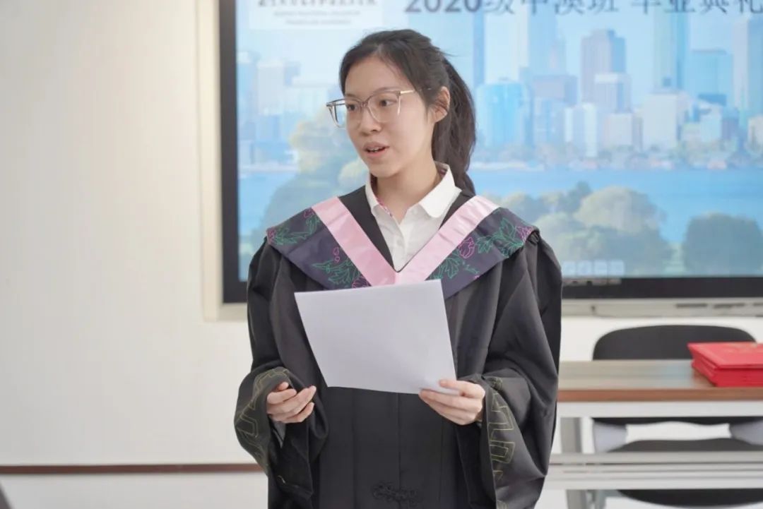 作为学生代表,夏采麟同学在发言中满溢感恩之情。她深情回顾了在中澳班的学习时光,诚挚感谢老师们的悉心教导与无私付出。她深刻感悟到,真正的国际化人才肩负着搭建不同文化交流桥梁的重要使命。即将踏入莫道克大学开启全新征程,她满怀憧憬与信心,坚信这段海外求学经历将助力自己蜕变为更加独立自信、全面发展的新时代青年。