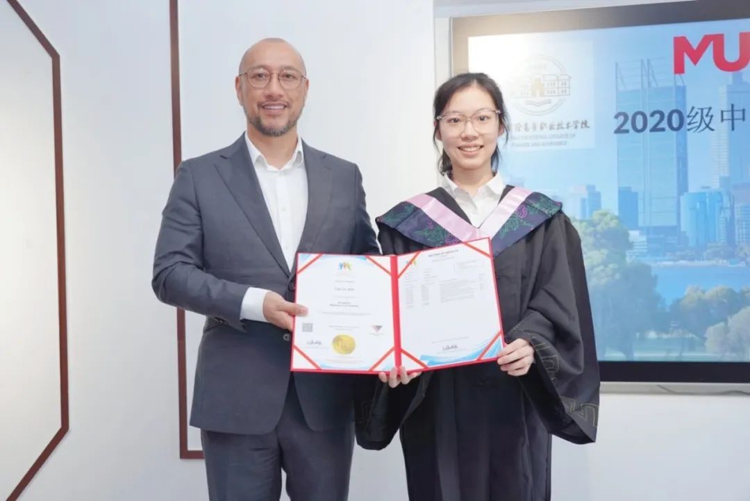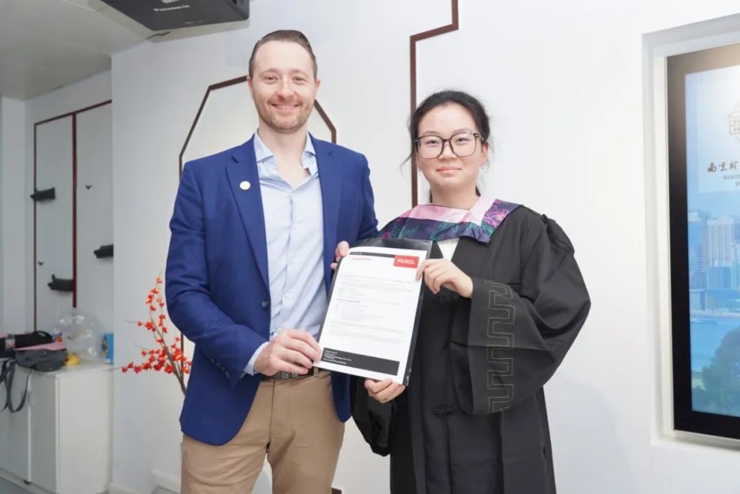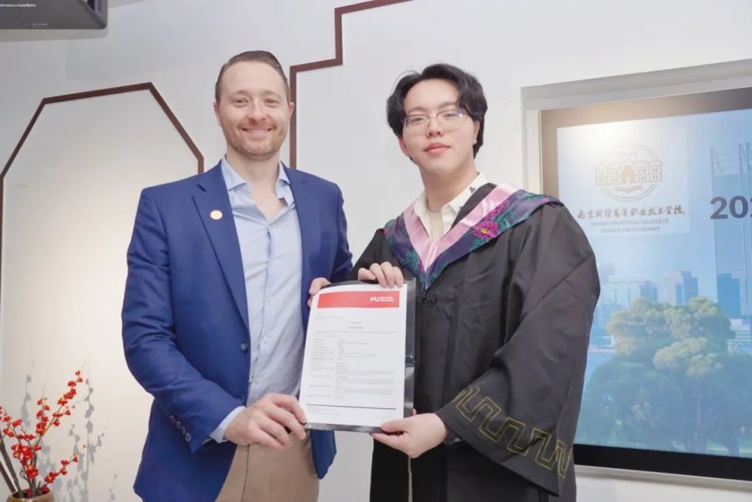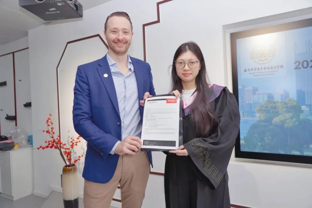 WAIFS学院院长肖恩亲手为毕业生们颁发WAIFS学院毕业证书,莫道克大学国际处主管尤安则郑重授予莫道克大学录取通知书,并向毕业生们致以热烈祝贺。这份承载着汗水与梦想的证书,既是对过往努力的认可,更是迈向未来的通行证。
