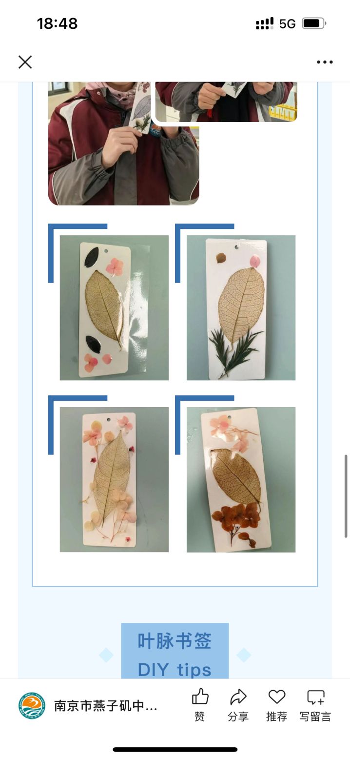 为了丰富学生的课余生活,燕中迈皋桥校区高一年级于12月27日举办“巧手制书签,绿叶韵书情”生物特色活动,让学生了解植物的叶脉结构和特点,培养学生的动手能力和创造力。活动带领同学们亲手抚摸大自然的纹理,在分明的纹络中感受自然之美,细嗅树叶清香,一起在生物的魔法下,创造出属于自己的艺术品!