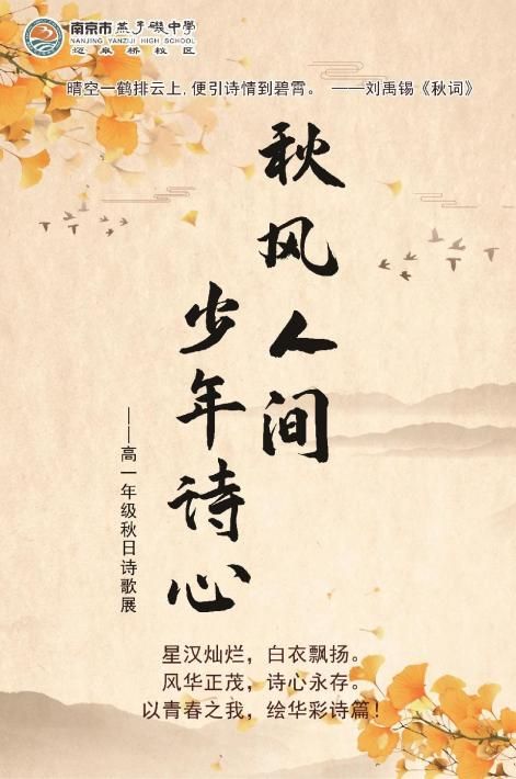 时维九月,序属三秋。为了增添校园书香气息,丰富同学们的课余文化生活,燕中迈皋桥校区高一年级举办了“秋风人间,少年诗心”秋日原创诗歌创作比赛暨诗歌展活动。少年们怀揣着一颗颗跃动的诗心,以他们那灵动而细腻的笔触,蘸满真挚的情感之墨,精心勾勒出一幅幅秋风中的人间百态画卷。他们字里行间,不仅流淌着对大自然无尽的赞美与敬畏之情,更彰显出对梦想坚定不移的执着追求,以及那份源自心底、对生活深沉而炽热的热爱与深刻感悟。这是一场心灵与文字的交响,是青春与诗意的邂逅,让人心生向往,回味无穷。
