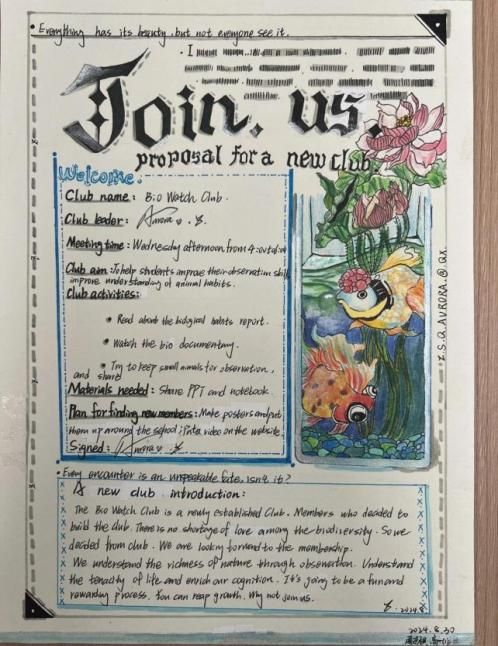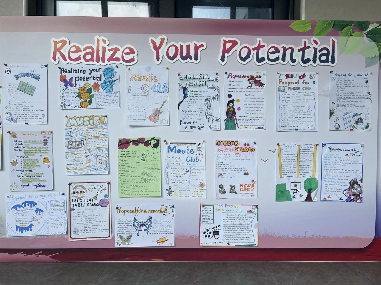 他们挥洒想象,放飞创意,以画笔为舟,英语为帆,精心绘制了一幅幅充满奇思妙想的海报。这些海报不仅内容丰富,形式多样,而且各具特色,异彩纷呈。有的以环保俱乐部为构想,深情呼唤大家携手共筑绿色地球的美好愿景;有的则以音乐俱乐部为蓝图,希望通过音乐的旋律传递快乐与正能量,让心灵在旋律中起舞;还有的则聚焦于科技俱乐部,鼓励同学们勇敢探索科学的浩瀚星空,追寻真理的光芒……每一幅海报都是同学们智慧与创意的结晶,展现了他们对未来的美好憧憬与无限向往。
