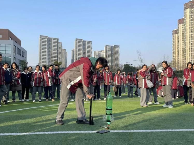 比赛当天,操场上热闹非凡。参赛同学自信满满,带着精心制作的水火箭在发射区准备。随着指令下达,水火箭在高压水流推动下发射,有的直冲云霄,有的划出优美弧线,赢得阵阵喝彩。表现优异的水火箭在高度、轨迹精准度和滞空时间上表现出色,充分体现了同学们对物理知识的运用和实践能力。此次比赛让学生将知识用于实践,培养了团队协作与创新探索精神。回顾一路,师语淳淳,书声琅琅。