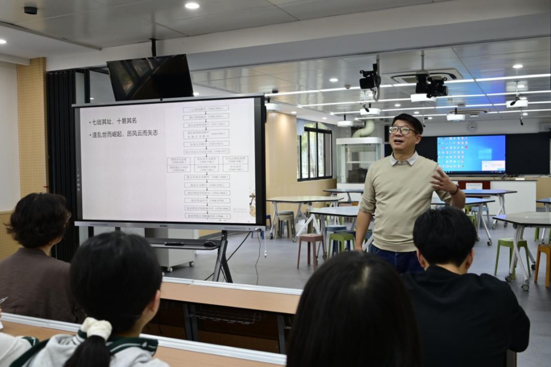 南师附中校友刘煜老师以“为甚读书,为吾人类大众”的主题对南师附中的校史进行了详细的介绍。这是一段“逢乱世而崛起,历风云而矢志”的激昂历史,三首校歌无一不与时代和社会紧密相连,正如同附中命运与国家和民族命运相连一般。在附中历史中,涌现出无数仁人志士、青年英烈和国家院士,用实际行动践行着“嚼得菜根,做得大事”的校训和“诚 朴 雄 伟”的校风。同学们在此氛围中深受震撼,受益匪浅。
