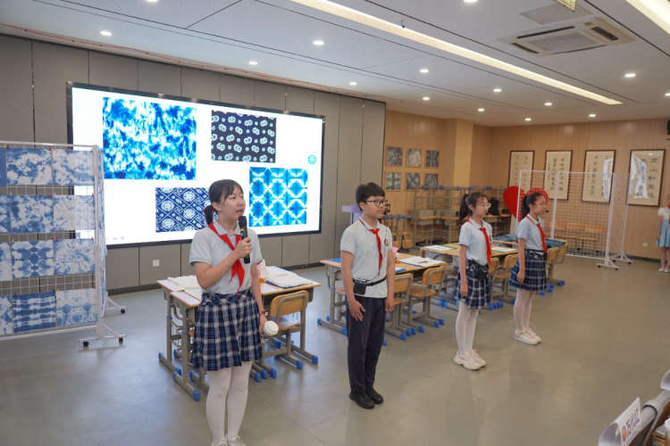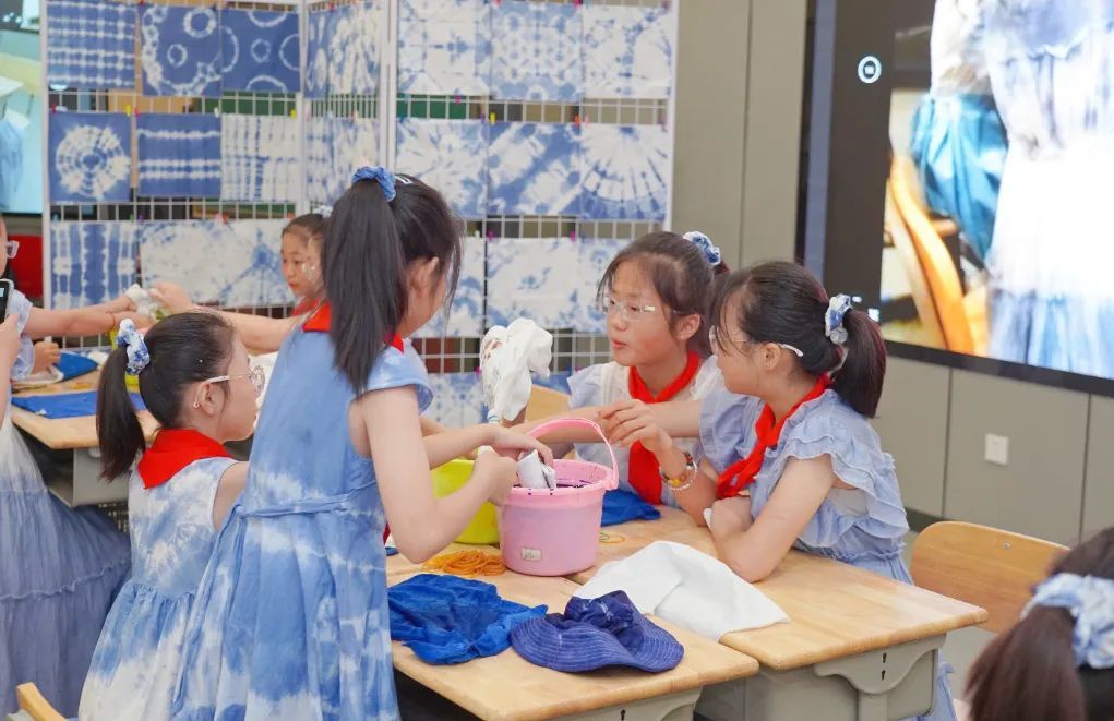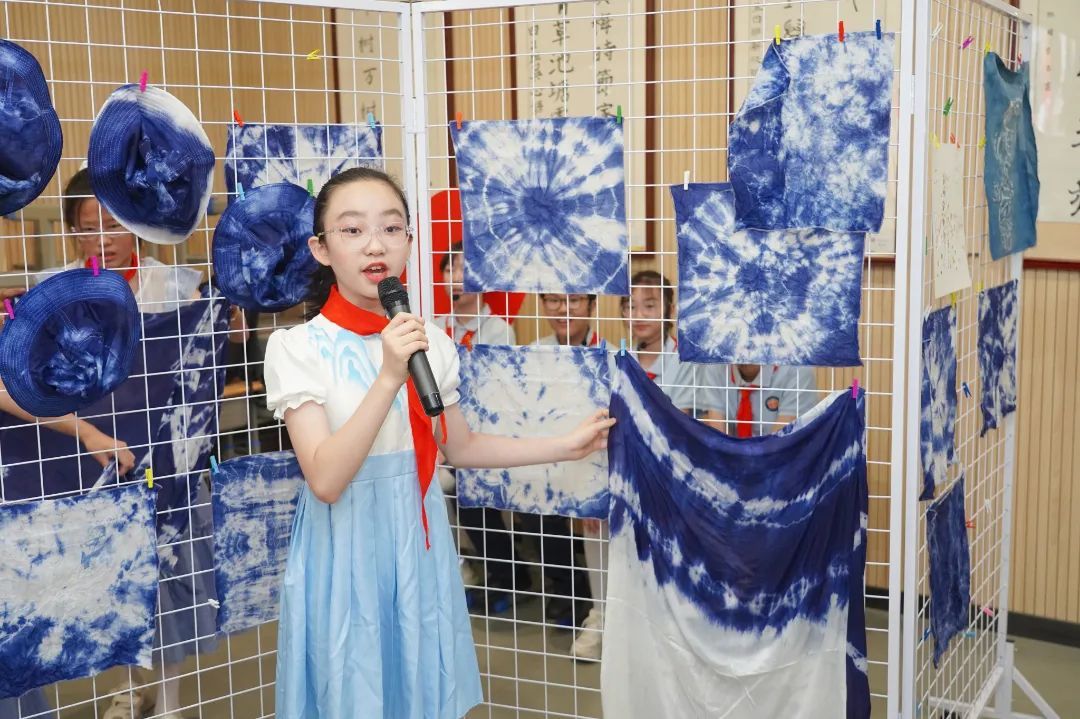 项目化学习汇报展示环节,同学们化身“小小非遗传承人”,生动呈现了传统扎染与蓝印花布的制作过程,展现了劳动教育与文化传承的深度融合。扎染组的同学用皮筋精心捆扎棉布,浸入板蓝根植物染料中,通过“扎、浸、染、擦、拆”五道工序,创作出蓝白相间的独特纹样。蓝印花布组的同学则伏案执刀,专注刻版、刮浆,在布面上勾勒出细腻流畅的传统纹样。