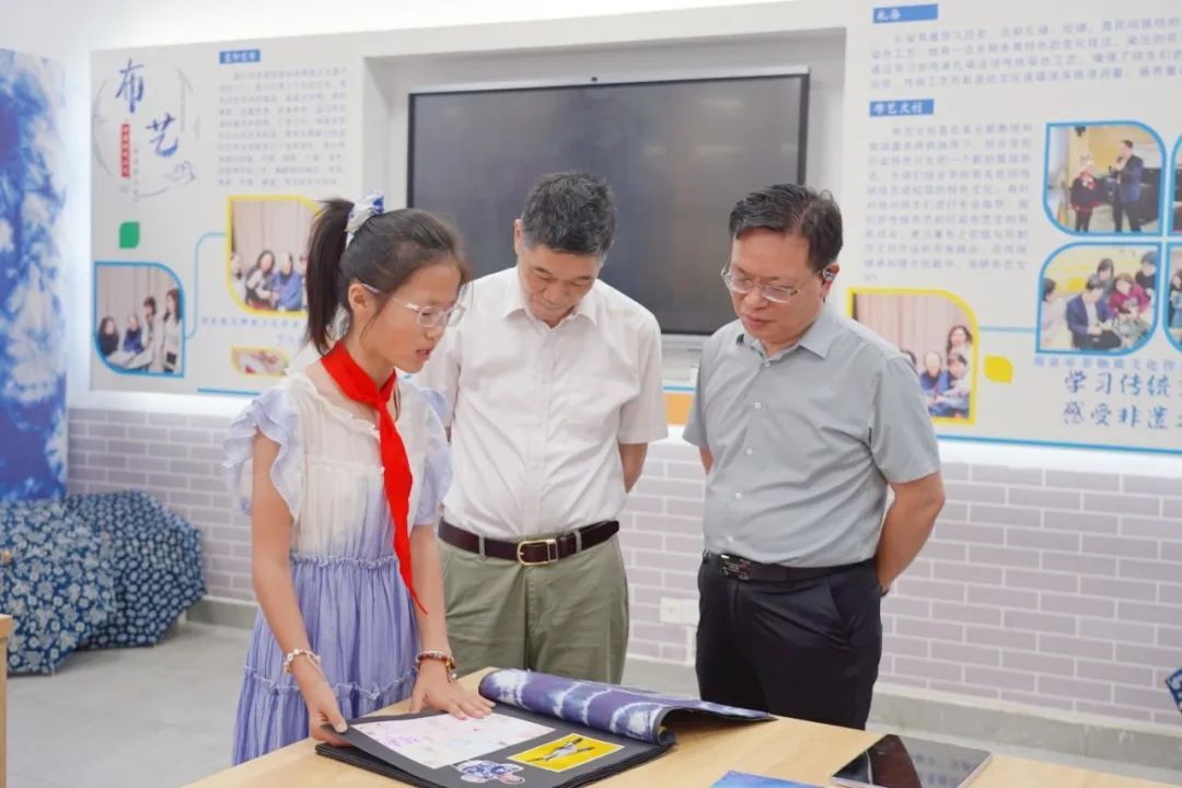 与会嘉宾参观了学校“鑫动布艺馆”特色展区,欣赏师生共同创作的扎染、蓝印花布等非遗作品,并在互动体验区体验糖画制作、端午香囊缝制等非遗文化项目。