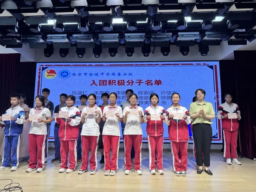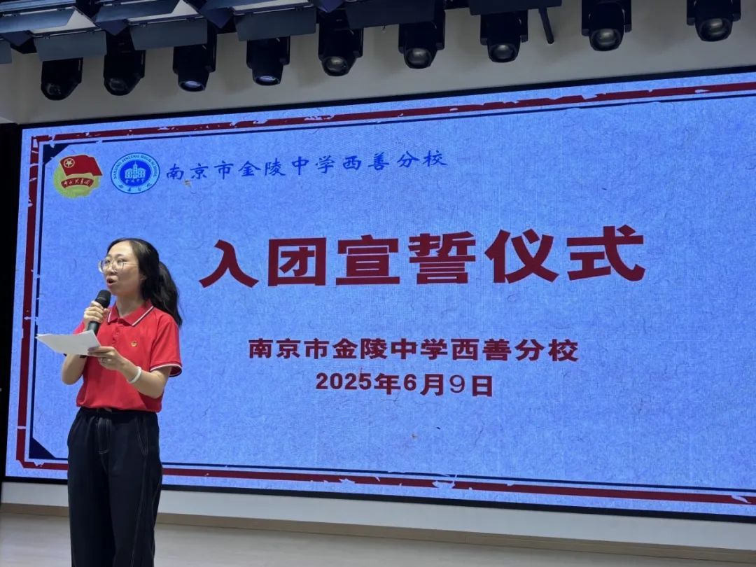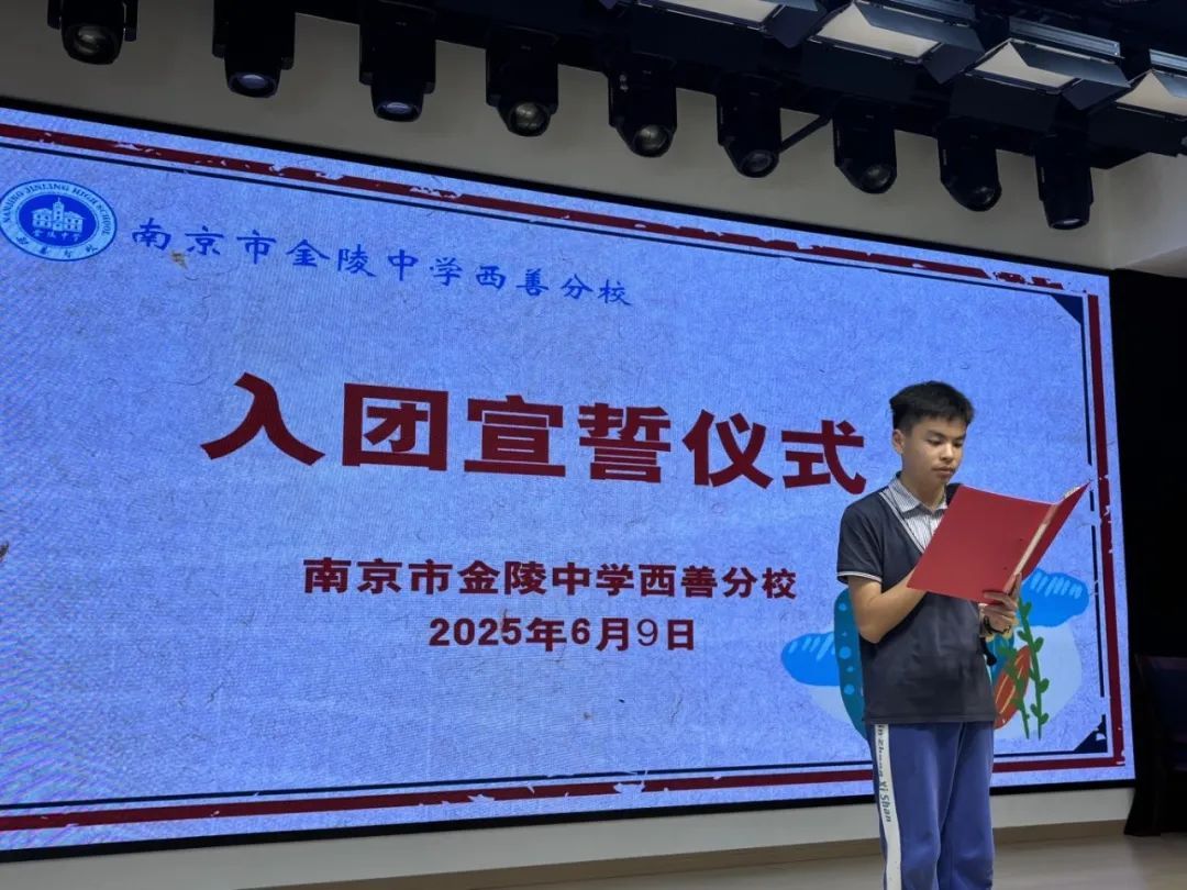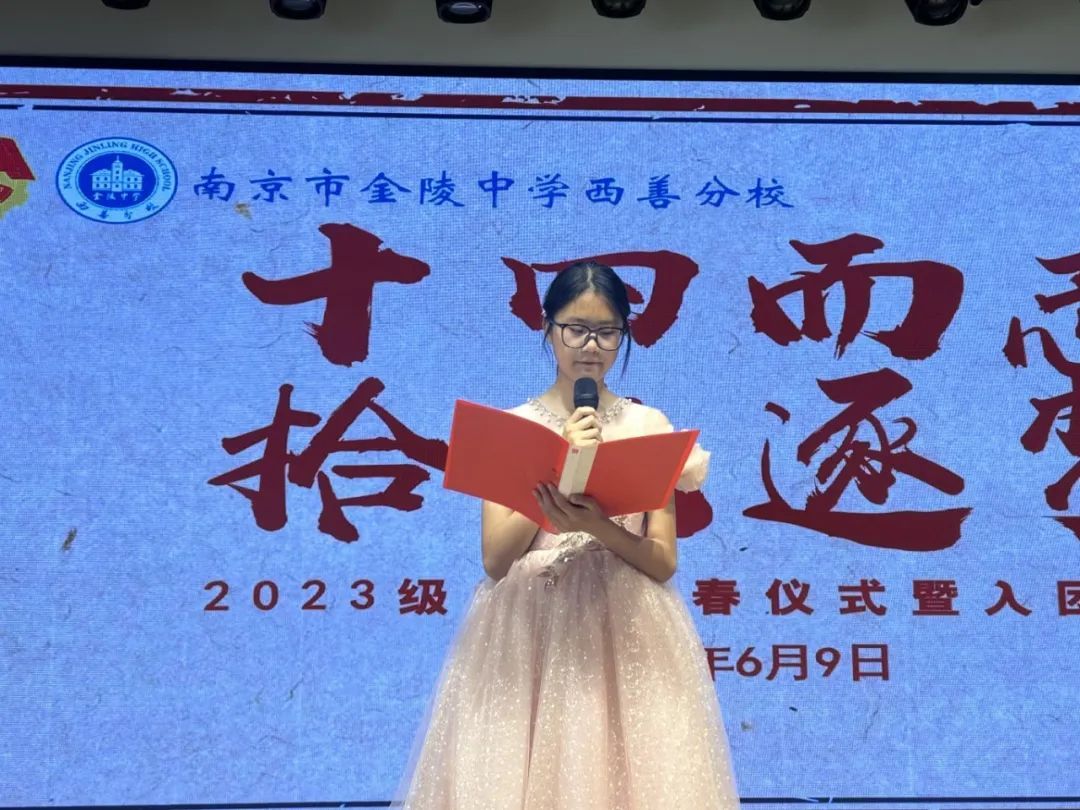 2025年6月9日下午,南京市金陵中学西善分校隆重举行“十四而志,拾光逐梦”2023级学生青春仪式暨入团仪式。活动由徐歆然、赵瑾萱两位同学主持,林祥副校长、团委王雅卿书记、初二年级蒋安邦组长、党员及团员教师代表、家长代表、初二年级班主任及全体学生齐聚一堂,共同见证这一青春盛典。