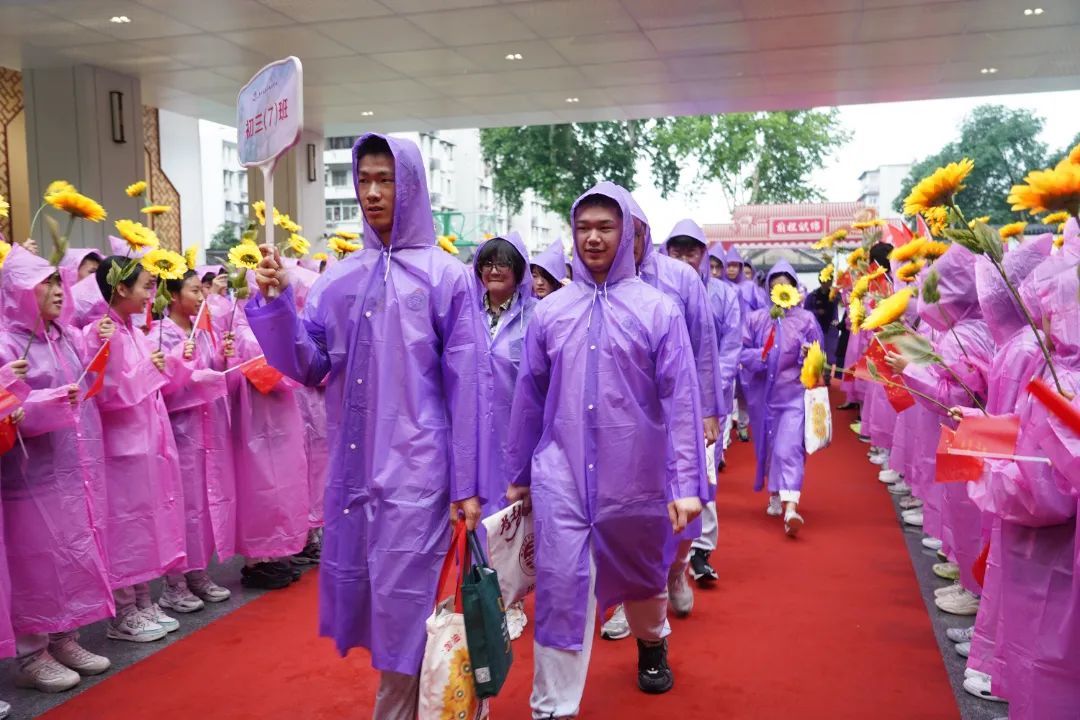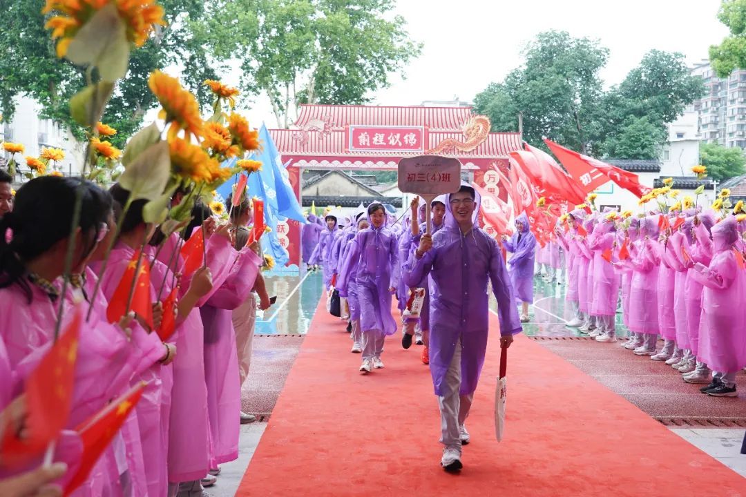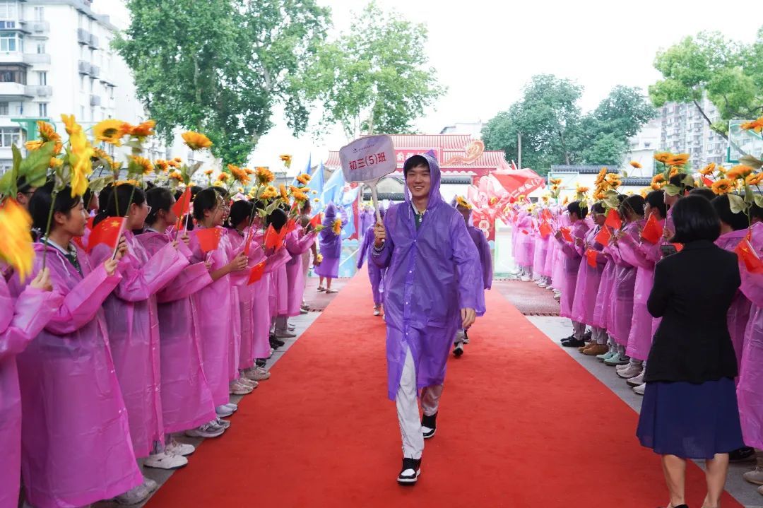 全体初三学子挥舞班旗,在师长的夹道祝福中踏上红毯,与恩师击掌拥抱,倾听学弟学妹“中考加油”的呐喊,迈向象征胜利的“凯旋门”。