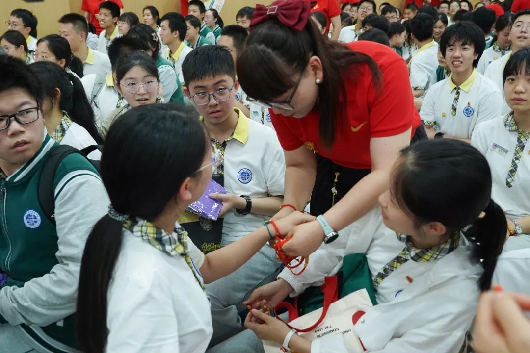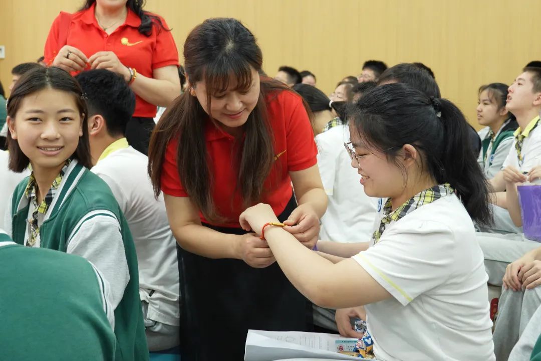年级组还特别定制了“中考必胜”手环,老师们亲手为学生佩戴,红色手环与学子们坚毅的目光交相辉映,寓意“手环一戴,好运自来”。