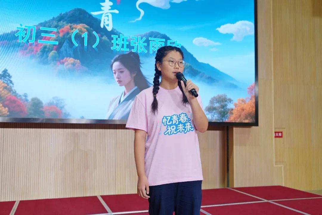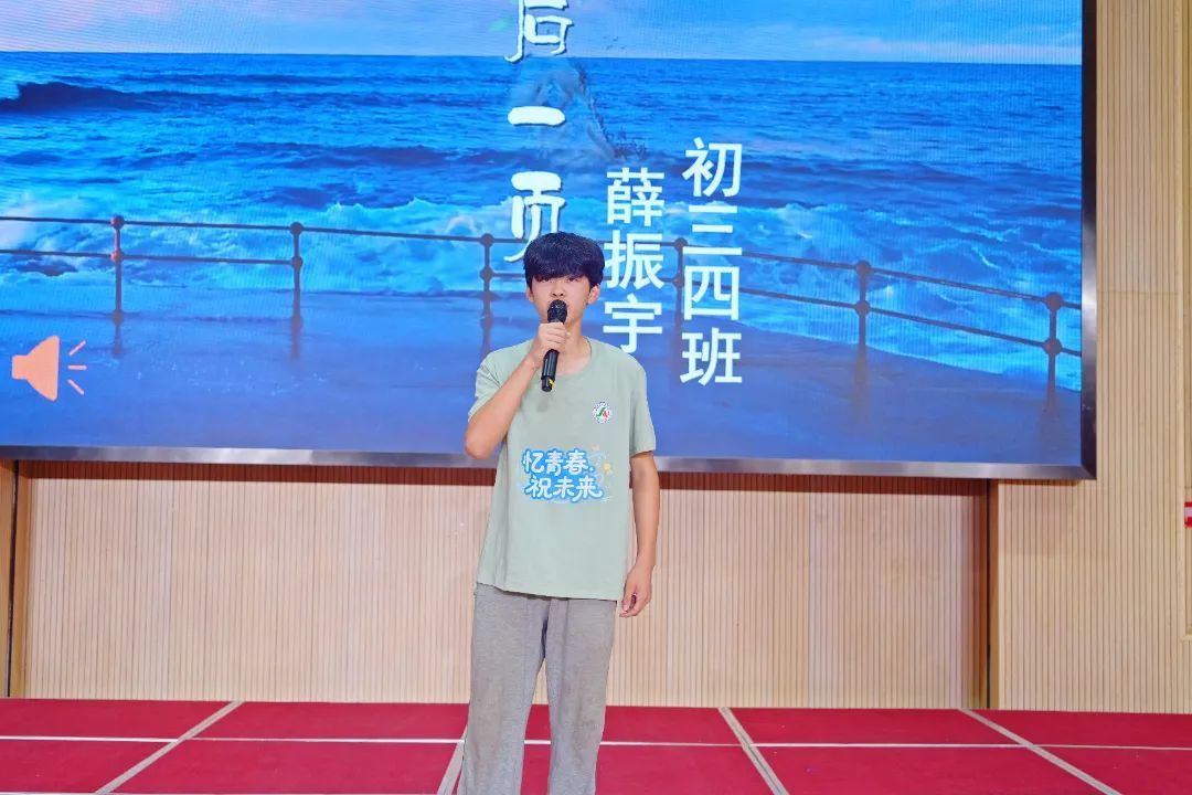 初三(3)班程采祥和中专班何思雨作为学生代表依次上台发言,他们对老师们的辛勤付出与家长的坚实支持表示感谢,并承诺将用奋斗书写青春华章,向着未来勇敢前行。