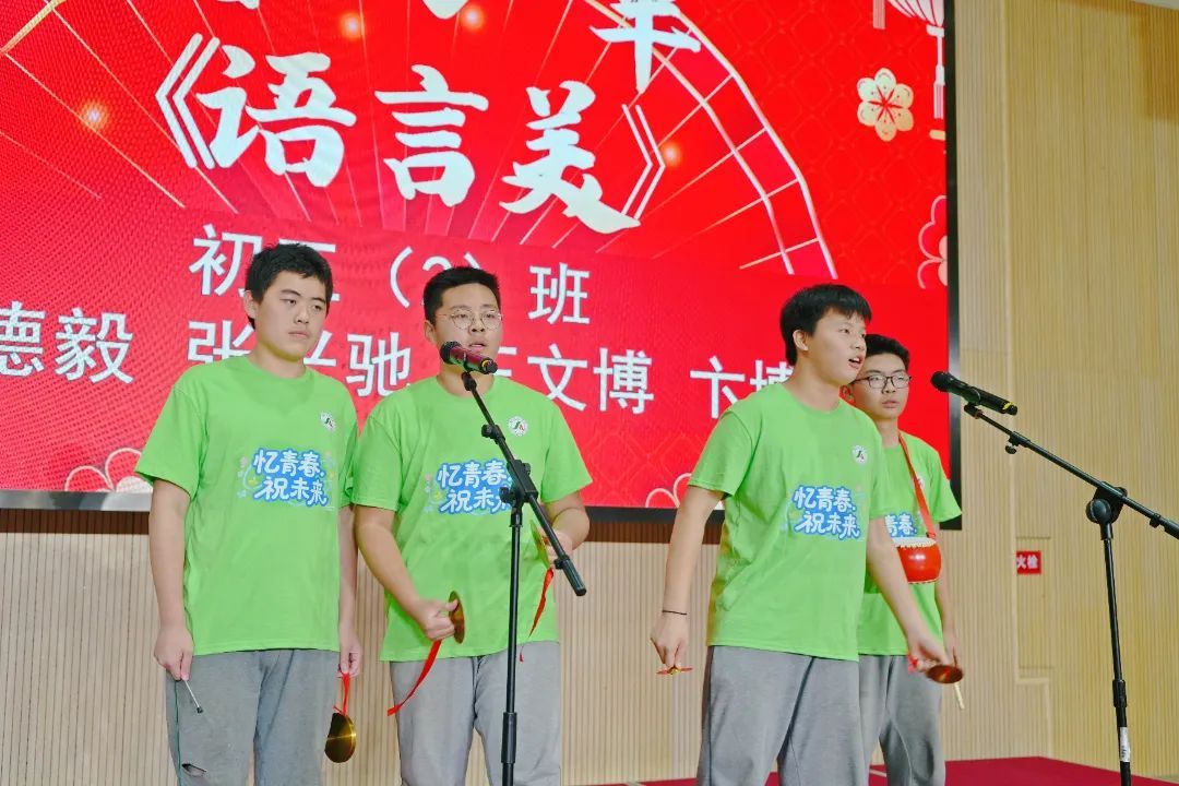 初三(1)班张雨欣带来歌曲《辞青》,初三(4)班薛振宇带来歌曲《最后一页》,初三(2)班四位同学带来三句半表演《语言美》,瞬间点燃全场气氛。