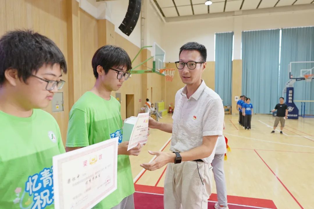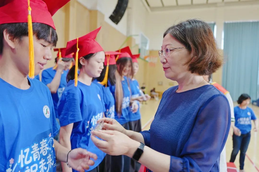 南京市建宁中学副校长张爱华代表学校向毕业生赠送定制纪念礼物,每件礼物都镌刻着专属的青春印记,寄托着母校对学子的深切期许。
