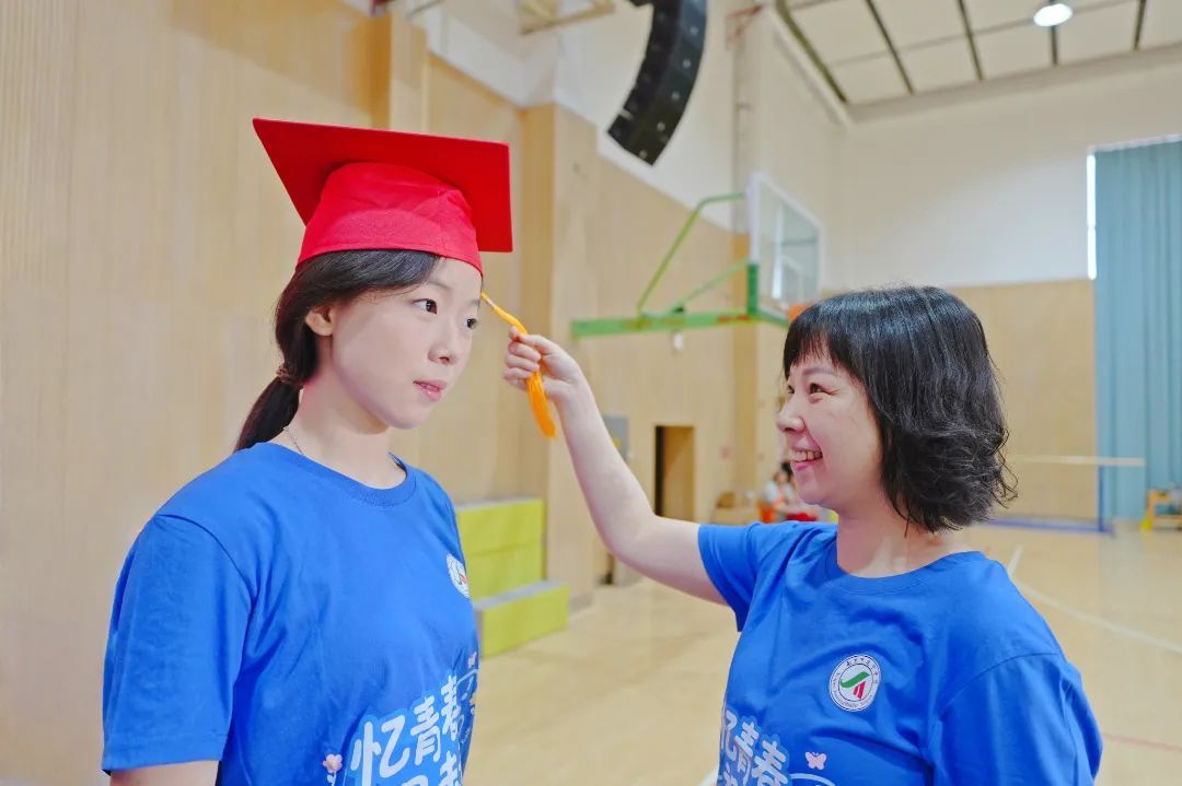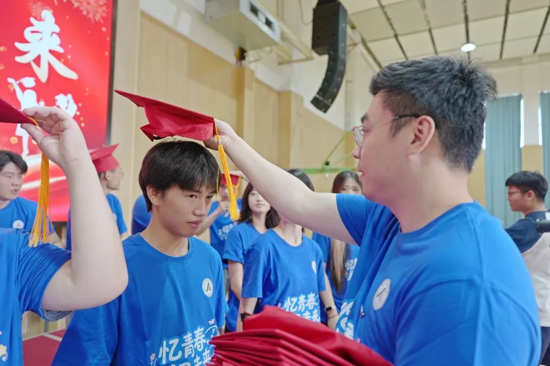 电商班班主任刘研与方莹两位老师亲手为毕业生戴上成人礼帽并完成拨穗仪式,鲜红的帽穗从右侧拨至左侧,象征着少年从青涩走向成熟,正式叩响成人之门。