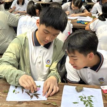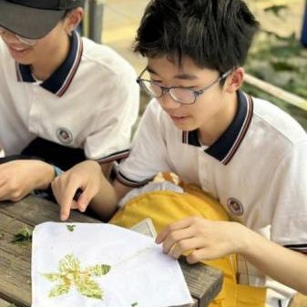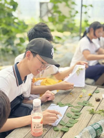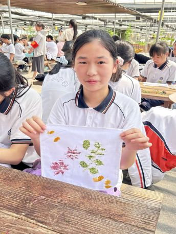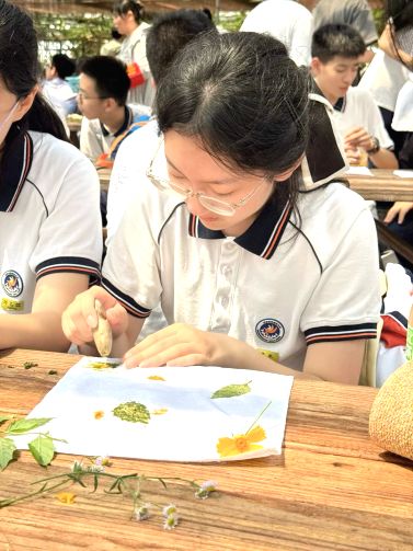 一方素净手帕化身创作画布。同学们在园中亲手采集形态各异的叶片与花瓣,通过耐心敲拓,将植物天然的脉络与色彩永久定格。一锤一落间,自然的呼吸悄然渗入织物,留下独一无二的生命印记。