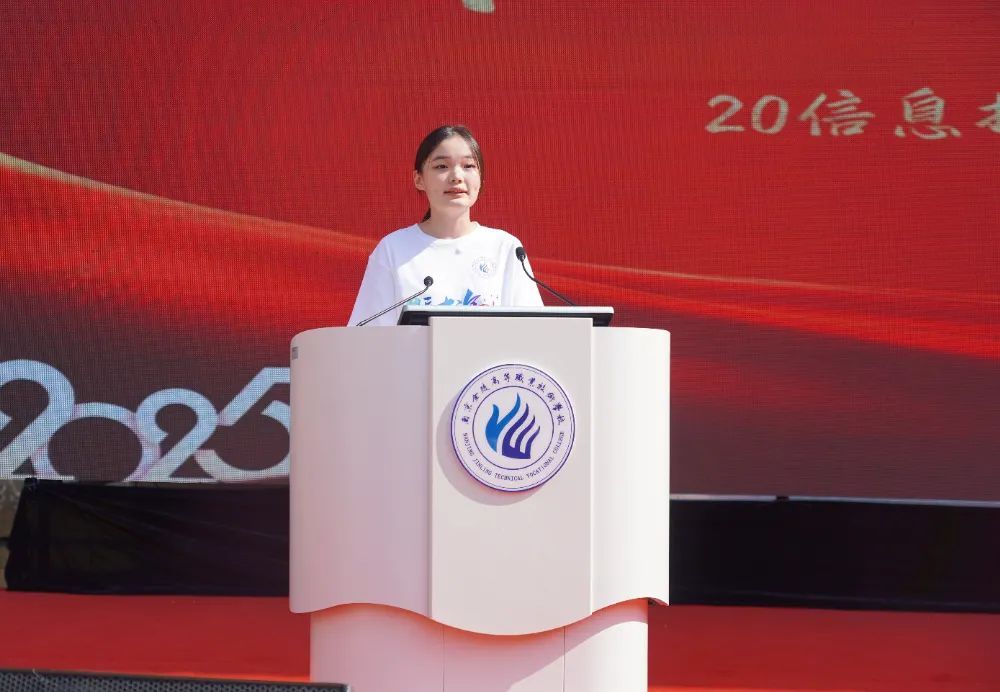 毕业生代表20信息技术高职2班解怡然同学号召同学们以踏实进取的姿态迎接未来挑战,用专业技能书写精彩人生。