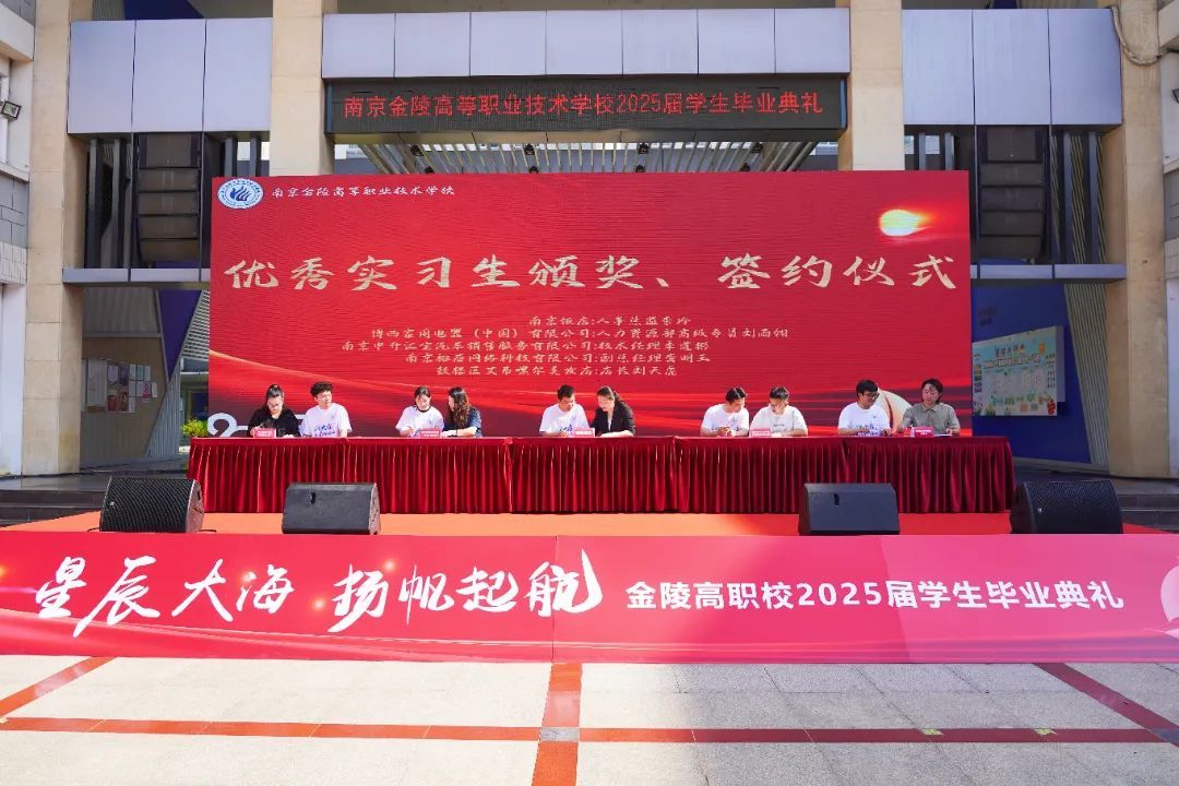 南京饭店、博西家用电器(中国)有限公司、南京中升汇宝汽车销售服务有限公司、南京裕后网络科技有限公司、南京市鼓楼区艾弗嘿尔美发店五家企业代表为“优秀实习生”颁发荣誉证书,并与他们现场签订就业协议。