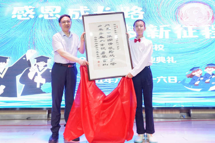 王元恺同学代表六年级全体学生,向母校赠送毕业纪念品,一幅由王元恺同学饱含对母校深情撰写的书法作品:门东古雅润情怀扬帆学海 少年青春立宏志勇攀书山,表达了毕业生们对母校深深的感恩与祝福,南京秦淮外国语学校校长张加强上台接受纪念品。