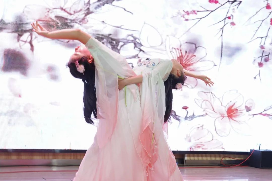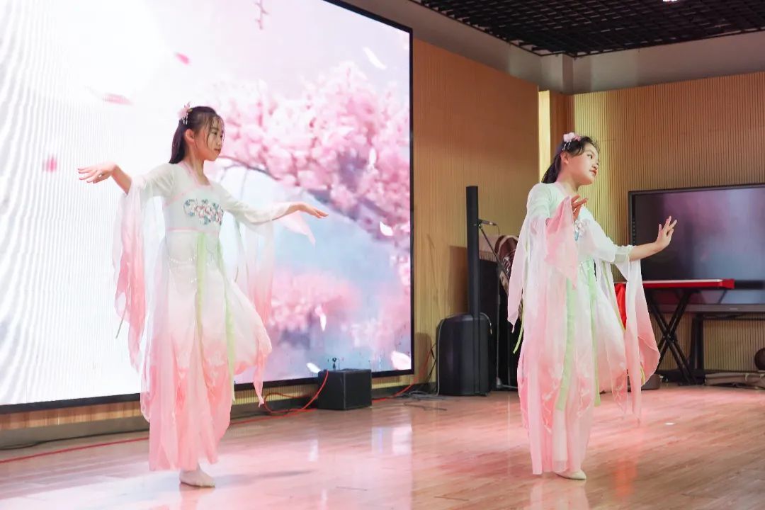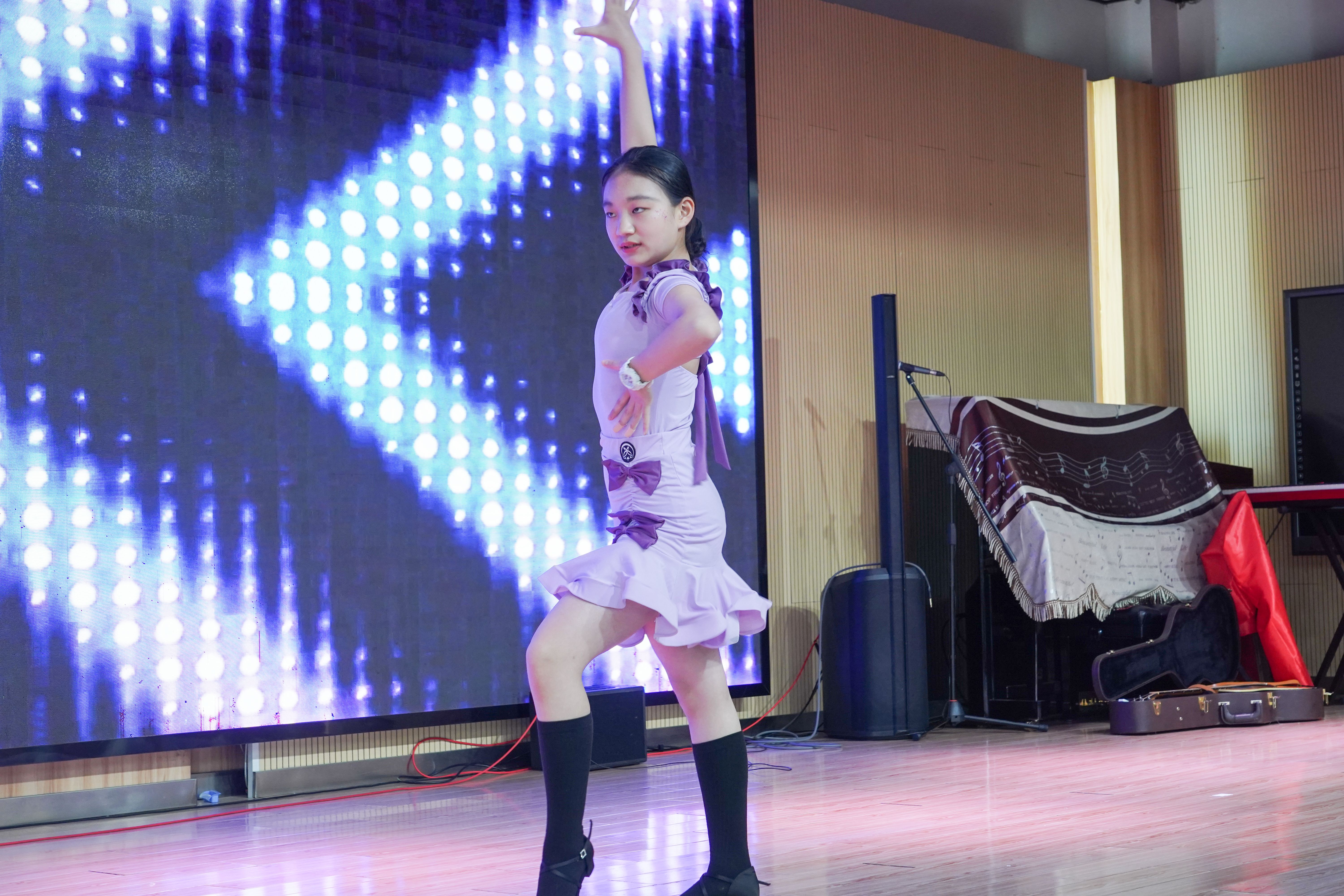 随后,六年级同学们献上一支热力四射的舞蹈串烧,在多元舞种的切换中泼墨出少年独有的鲜活画卷 ——当恰恰的响指叩开节奏之门,裙摆与流苏在旋转中甩出炽烈的弧线;转眼牛仔舞的靴尖踢碎空气,急促的顿点踩出西部旷野的不羁心跳;忽而水袖翻转间转入古典舞的韵致,流淌着水墨般的温婉身段,瞬间点燃全场气氛。