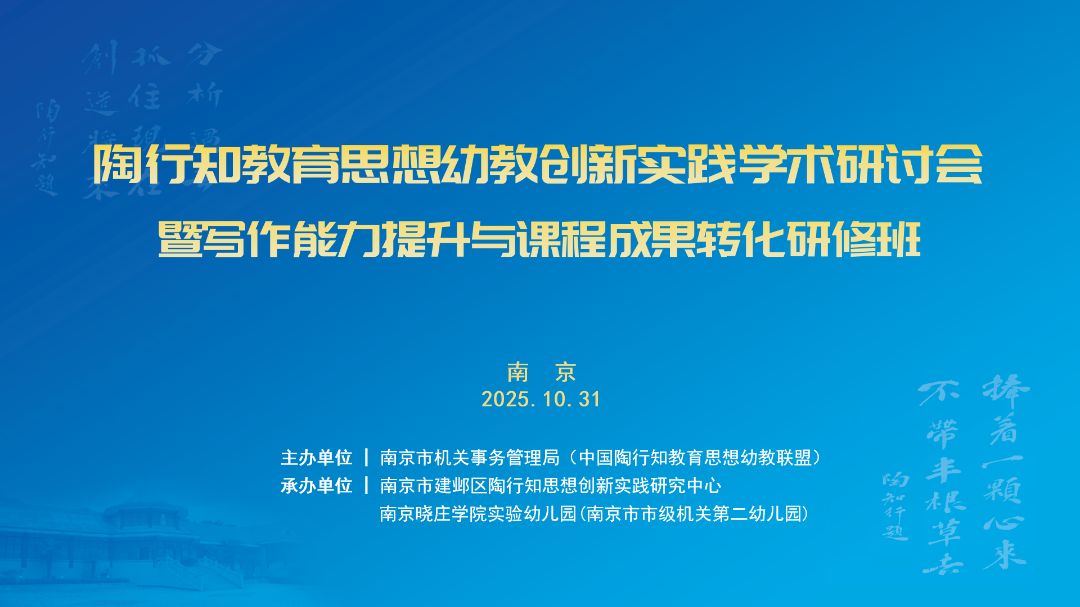 为推动陶行知教育思想幼教联盟的创新发展,进一步深化陶行知教育思想在学前教育领域的理论研究与实践应用,10月31日,由南京市机关事务管理局主办、南京晓庄学院实验幼儿园(南京市市级机关第二幼儿园)承办的陶行知教育思想幼教创新实践学术研讨会暨写作能力提升与课程果转化研修班在南京举办。南京市机关事务管理局领导、市陶行知思想研究会专家、建邺区教育局领导、区教师发展中心领导及陶行知教育思想幼教联盟实验园教师代表、建邺区幼儿园园长、骨干教师约90人出席会议。