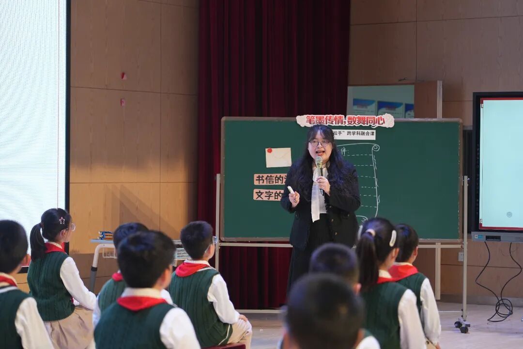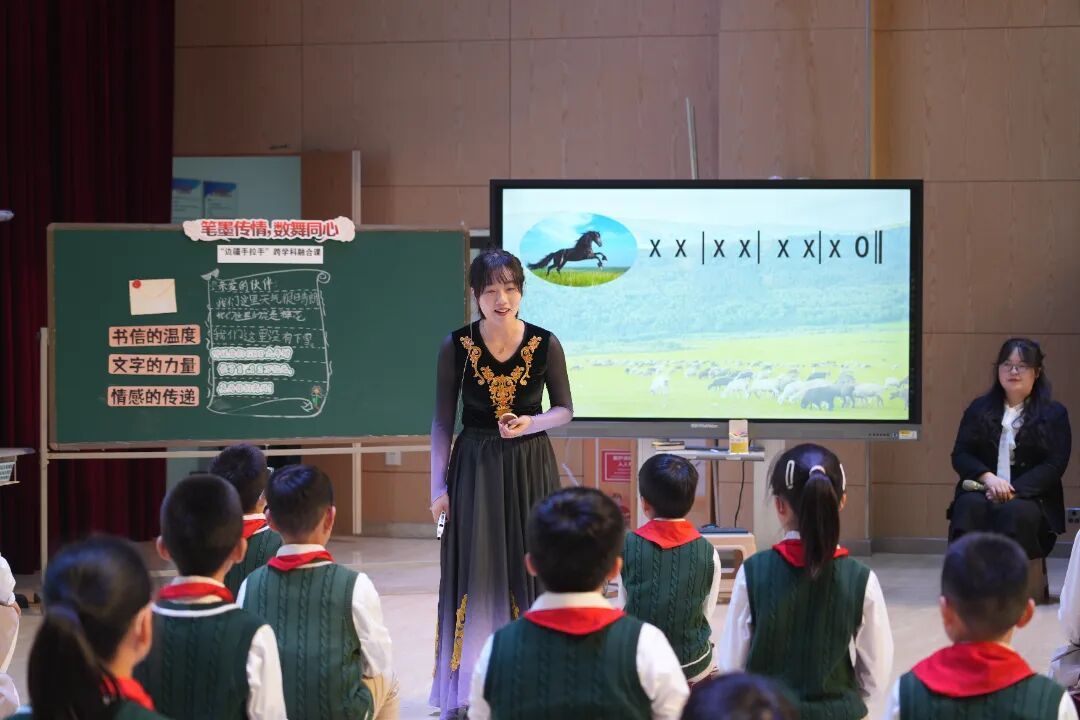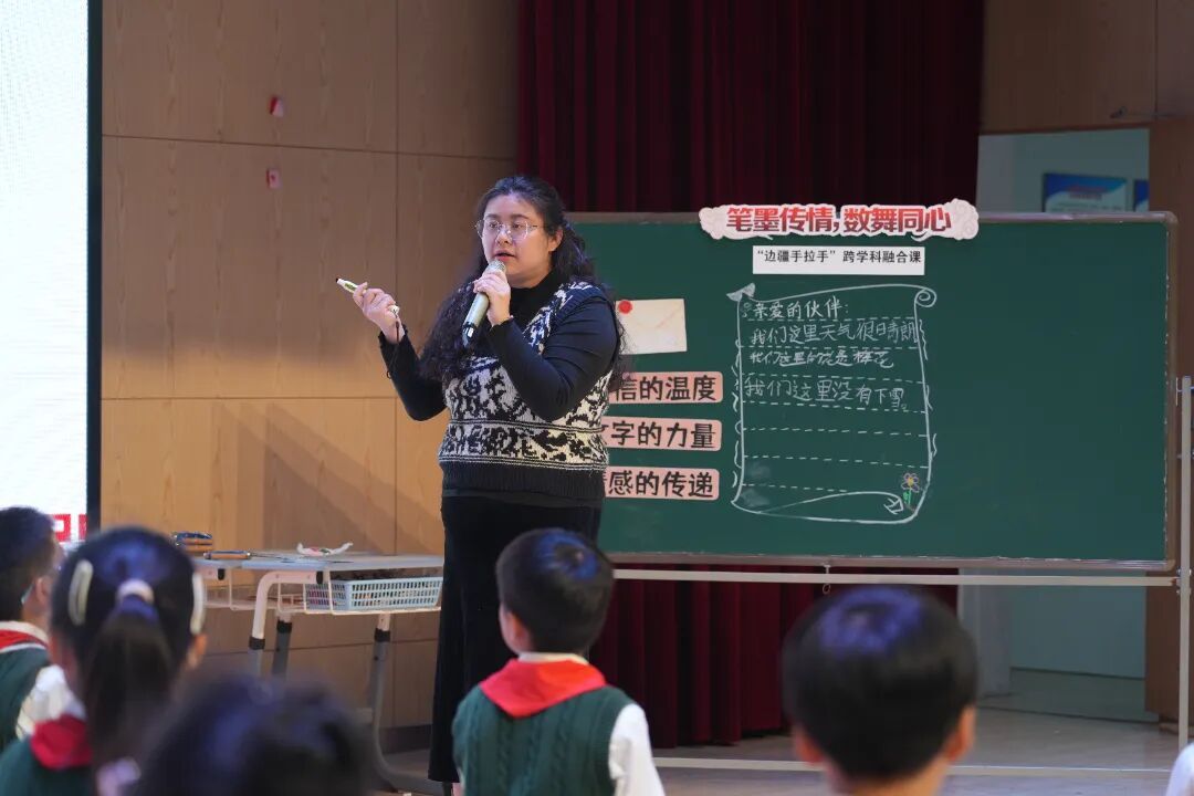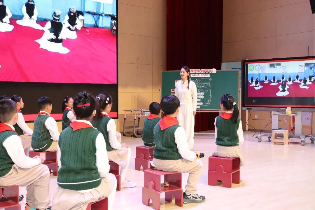 上坊新城小学奚玮老师、淳化中心小学朱燕文老师、上坊中心小学张楚楚老师和上坊新城小学周晓老师共同展示了《笔墨传情,数舞同心——“边疆手拉手”跨学科融合课》,从技术赋能教育的角度,探讨如何在人工智能时代守护教育的温度,为与会者提供了情感教育的新思路。