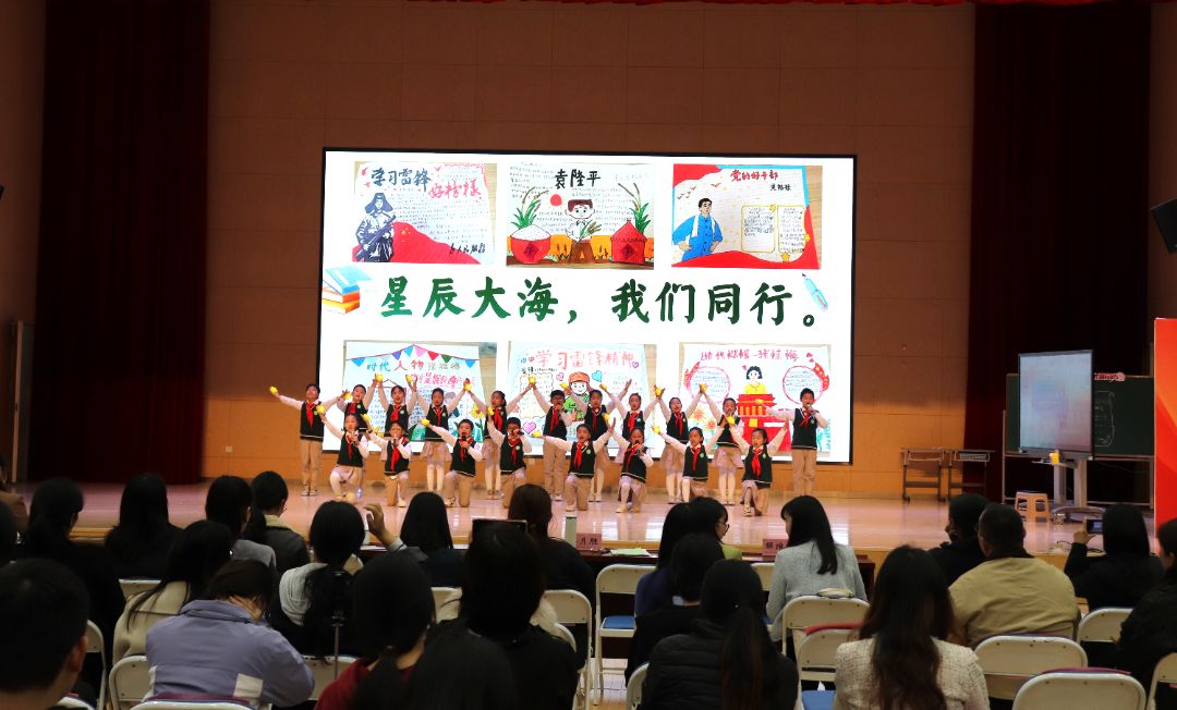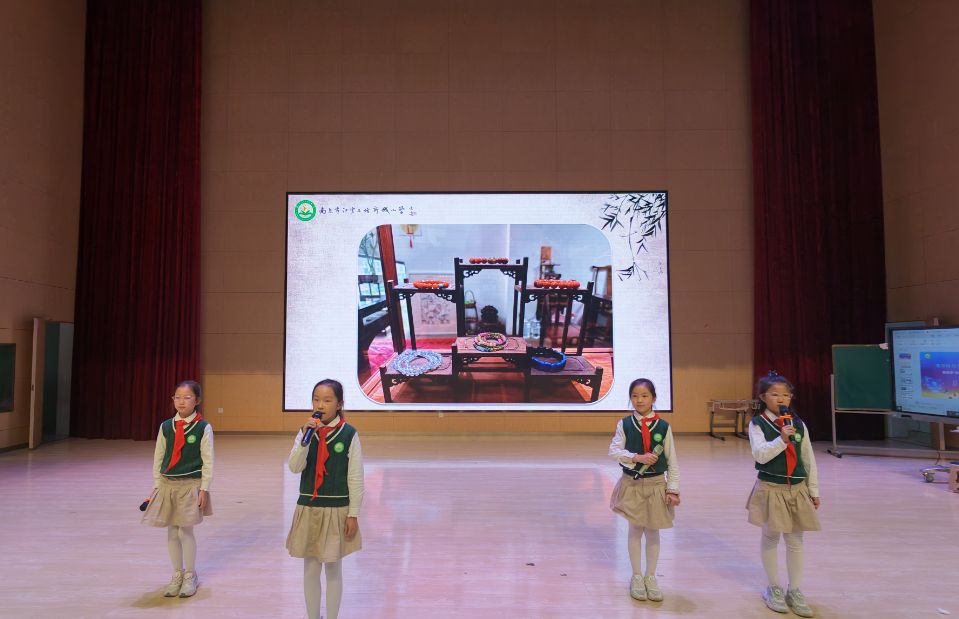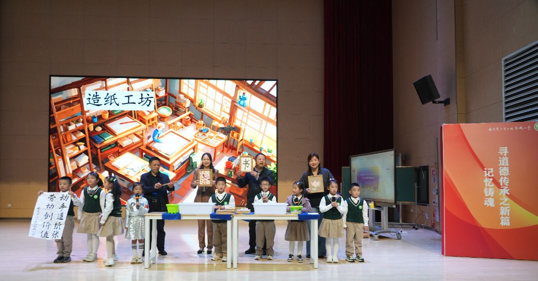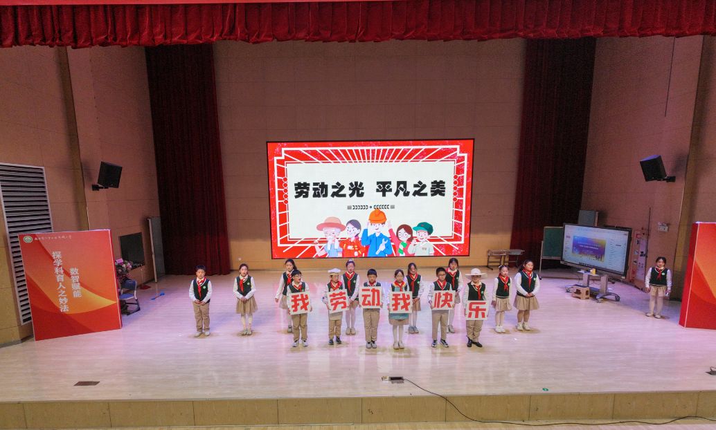 活动现场,上坊新城小学的学生们用丰富多彩的形式展示了“阅见匠心,筑梦成长——AI时代下的班级劳模工匠精神传承”的主题。从一年级小朋友演绎的情景剧《未来创造家:我们的第一张纸》,到二年级学生化身“非遗新生代”展示剪纸、绳结、面塑技艺;从三年级学生致敬奋斗者的《追光者》,到四年级学生分享寻访江宁“守艺人”的心得,再到五年级学生践行劳动精神的《劳动之光,平凡之美》,五个主题展演完整呈现了“读匠心、悟精神、践行动”的育人过程,让劳模工匠精神在孩子们心中扎根。