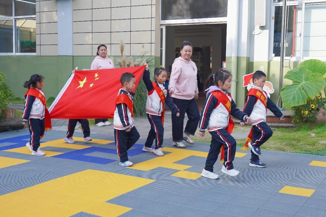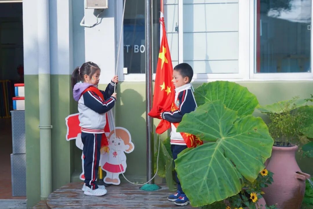 伴随着雄壮的国歌声,五星红旗冉冉升起,全体师幼肃立行注目礼,爱国情感在这一刻紧紧凝聚。