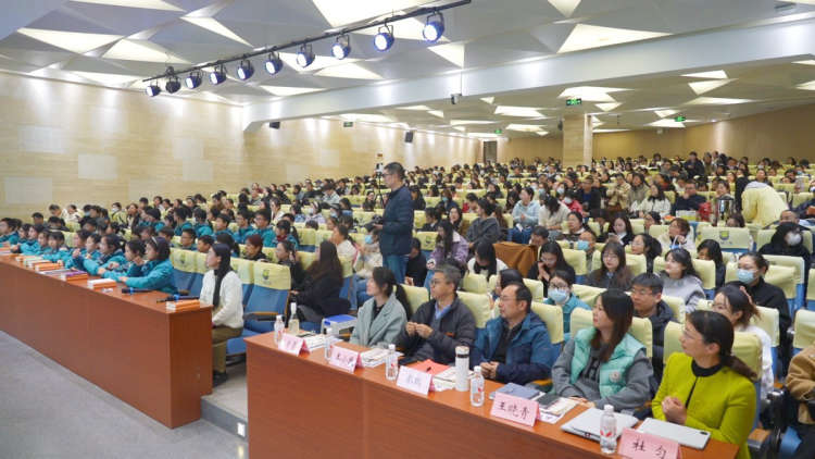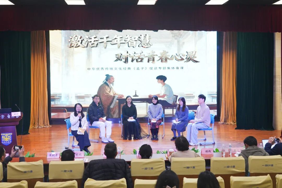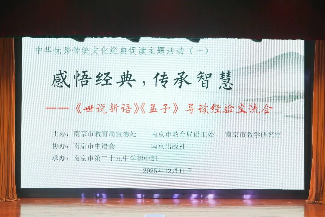 书林可栖,共读经典。为贯彻《新时代南京市中小学生中华优秀传统文化经典阅读行动方案》,探索经典阅读教学的有效路径,引导学生在中华经典诵读中启智润心、涵养品格,12月11日,由南京市教育局、南京市教学研究室主办,南京市中语会、南京出版社协办的中华优秀传统文化经典促读首场活动——“感悟经典,传承智慧”《世说新语》《孟子》导读经验交流会在南京市第二十九中学初中部顺利举办。全市各初中语文教师代表500余人齐聚一堂,聚焦经典阅读的教学实践与方法创新,共探育人新范式。