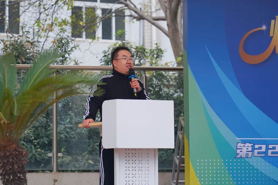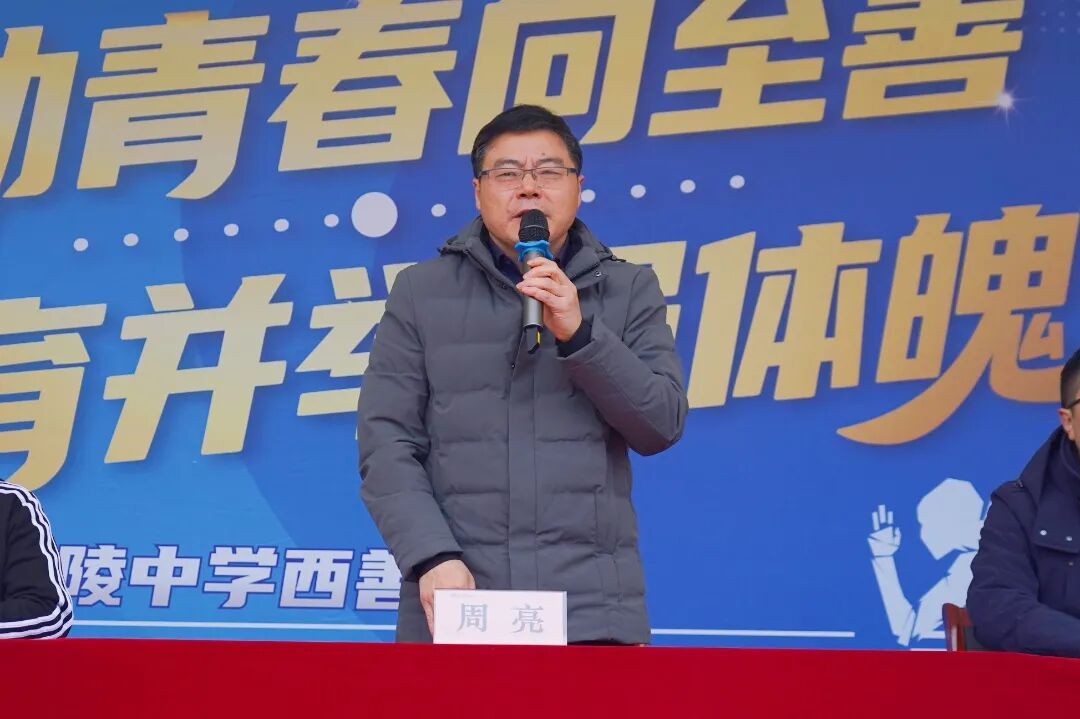 南京市金陵中学西善分校副校长李亮亮致辞,他表示本次运动会是学校“健康成长、快乐学习、自由创造”办学理念的最佳诠释,希望全体参赛同学能以昂扬姿态、奋进力量和拼搏汗水致敬体育榜样,传承体育精神,在赛场上重塑青春风采。