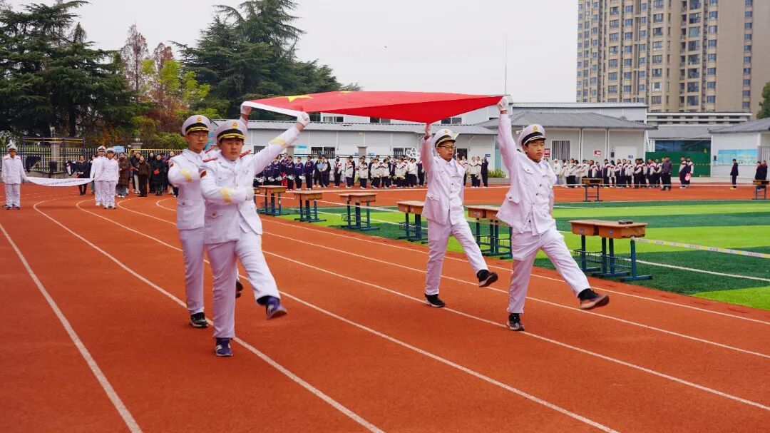 国旗队、校旗队方阵脚步铿锵,率先入场。鲜艳的五星红旗在晨光中猎猎作响,承载着师生滚烫的家国情怀与坚定信仰。校旗迎风招展,彰显着金中西善的奋进姿态与金中西善学子的独特风采。