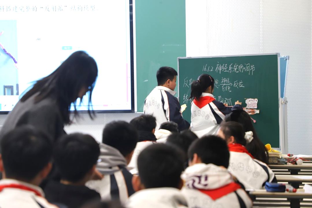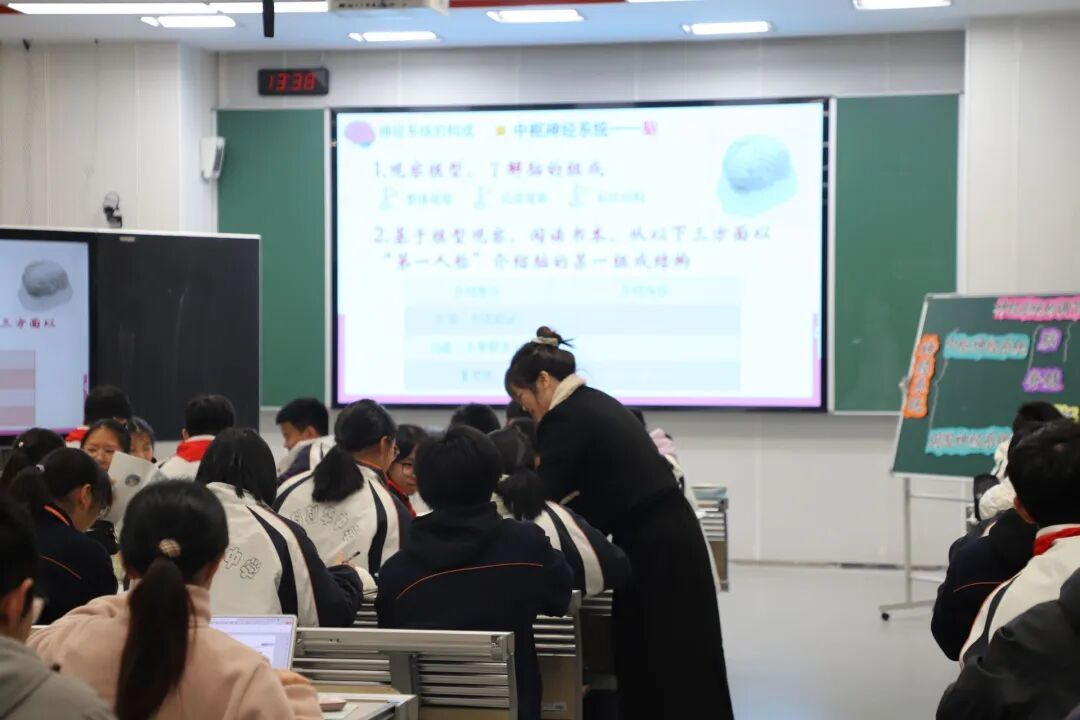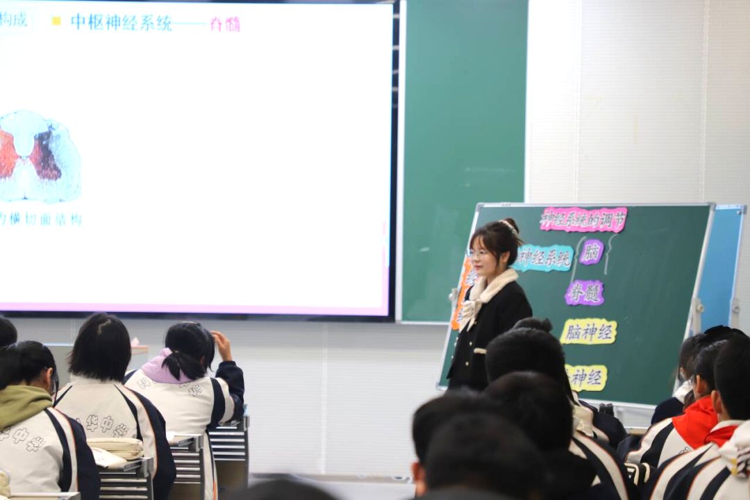首先,由我校朱茜莹老师带来《神经系统的调节》第一课时教学。课堂伊始,一场动感十足的节奏游戏迅速点燃学生热情,让学生在亲身体验中直观感知体内信息传递的奇妙过程。随后,朱老师引导学生开展模型观察与小组探究活动,系统讲解神经系统的组成架构,重点剖析中枢神经系统中脑与脊髓的核心功能。在神经元相关知识教学中,通过展示神经元模型,帮助学生深入理解其作为神经系统基本单位的精巧结构,进而领悟 “结构与功能相适应” 的生命观念。整堂课以学生体验为起点,以探究活动为载体,让学生在运用新知分析自身反应的过程中,完成从感性体验到理性认知的升华,既激发了科学探究热情,也强化了健康生活的自觉意识。