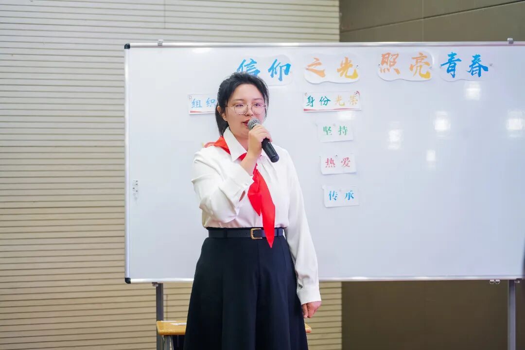 南师附中树人学校中队辅导员刘洵月带来微队课《信仰之光照亮青春》,她以队员胸前的红领巾为切入点,带领大家回顾了共青团波澜壮阔的发展历程,为让信仰内涵更具体,她重点分享了习近平总书记在黄土高原的知青岁月,进而引导队员领悟坚持的力量。队员们亲手 “点亮” 象征理想与信念的信仰之光,让青春与崇高的使命彼此照亮,也让个人的梦想与家国的使命共同生长。