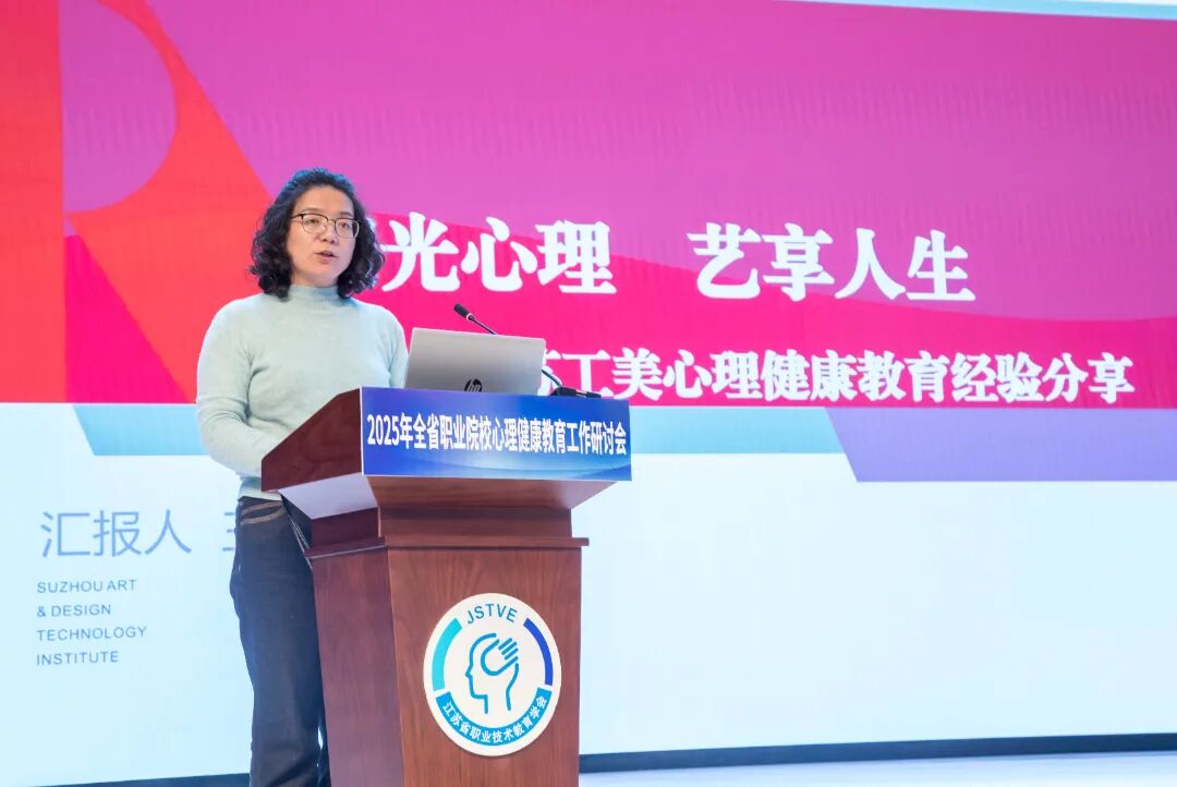 苏州工艺美术职业技术学院王瑞霞副教授以《阳光心理 艺享人生》为题,作交流分享,她结合“高预警低风险”的学生心理现状,介绍了依托艺术专业特色构建的“三重浸润”育人环境,分享了“四位一体”心育体系,重点阐述了将绘画、扎染、手工创作等艺术表达融入课程教学与实践活动的创新路径,以及延伸至社区志愿服务的特色心育成果。