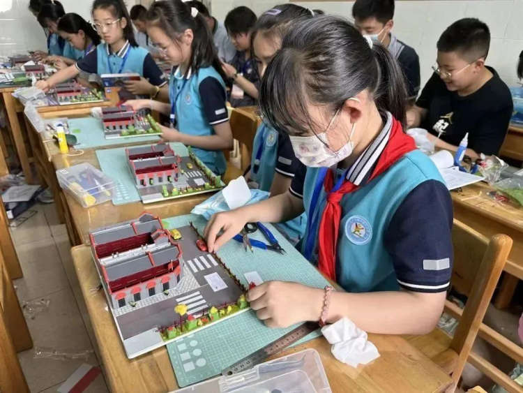在红船模型制作现场,二小娃们动作非常迅速,从熟悉图纸,拆装材料,队员们巧手翻飞,聚精会神,通过剪切、拆解、粘贴、拼装等,非常巧妙地将零部件组合一体。
