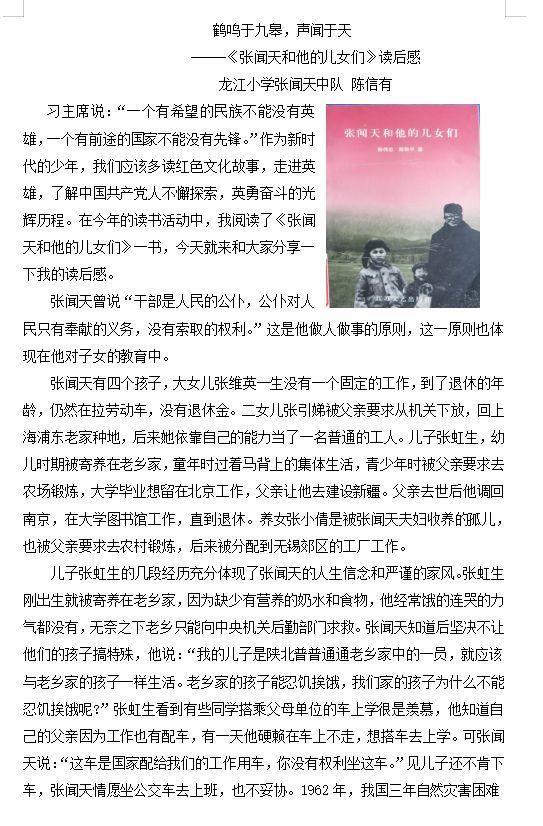 龙江小学建有张闻天图书室,张闻天中队的队员们利用其图书资源广泛阅读了张闻天爷爷的相关书籍,了解其生平历程及对党和国家做出的伟大贡献。