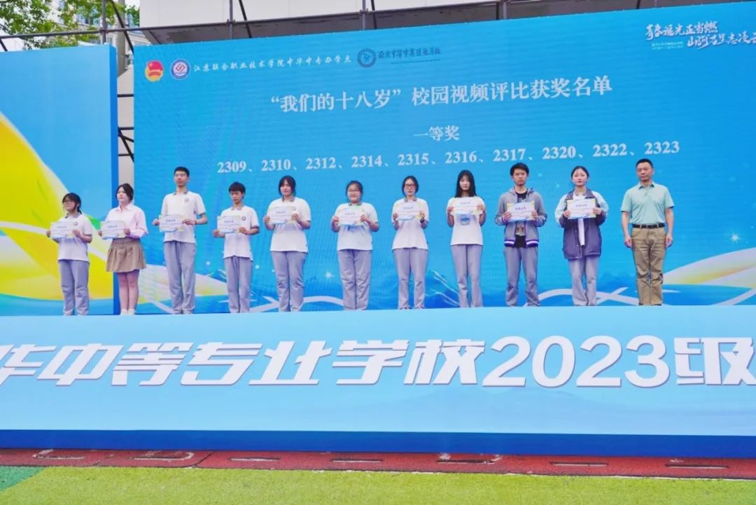 雨花台区教育局职社科秦金和科长、共青团雨花台区委综合科袁可科长为获得“我们的十八岁”校园视频评比活动特等奖的班级颁奖并合影留念。同学们接过的不仅是一纸荣誉,更是对创意表达、团队协作等综合素质的肯定。