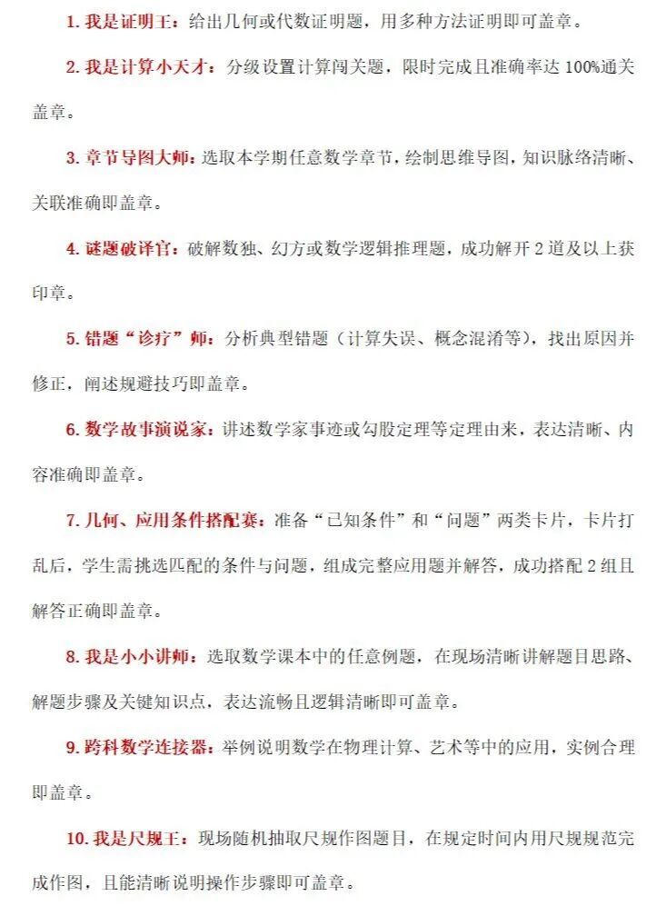 学校数学组围绕“实用与趣味并重”原则,设计10项特色闯关活动,涵盖几何证明、计算应用、逻辑推理、跨科融合等维度,全面覆盖对应学段核心知识。嘉年华教室设10个挑战岗,提前发放“闯关手册”明确规则,后勤团队完成道具、证书筹备,场地布置融入数学元素,为活动有序开展筑牢基础。