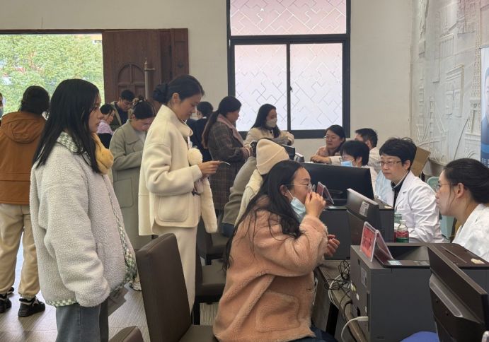 下午一点半,义诊活动正式启动。徐静、陈得良等多位主任中医师、副主任医师坐镇咨询台,为前来咨询的教职工提供专业诊疗服务。专家们耐心倾听诉求,细致开展血压、血糖等基础检查,针对颈椎腰椎不适、失眠焦虑、呼吸道疾病、妇科调理等教职工高频健康问题,逐一给出个性化的用药指导、饮食建议与运动调理方案,并认真记录诊断意见。