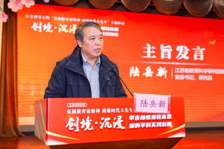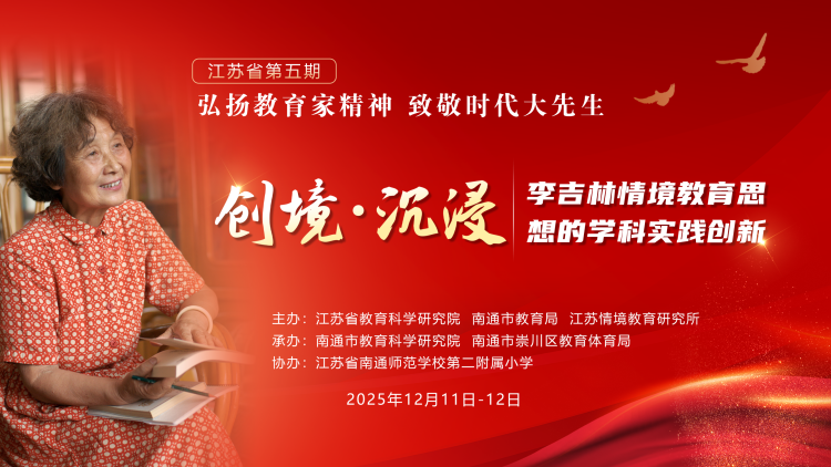 为深入贯彻《教育强国建设规划纲要(2024—2035年)》和《中共中央国务院关于弘扬教育家精神 加强新时代高素质专业化教师队伍建设的意见》,认真落实教育部“教育家精神万里行”活动要求,12月11日—12日,江苏省教科院、南通市教育局、江苏情境教育研究所围绕“创境·沉浸:李吉林情境教育思想的学科实践创新”在南通联合主办江苏省第五期“弘扬教育家精神 致敬时代大先生”主题活动。省教科院院长、党委书记陆岳新出席活动并讲话,中国教科院基础教育研究所副所长王玉国,《中国德育》发展中心主任赵广忠,省教育学会名誉会长陆志平作点评指导,南通市教育局党组副书记、副局长朱全中,崇川区教育体育局党组书记、局长陆红兵致辞。全省300多位教师代表参加线下会议,省内外4万多名教师参加线上会议。