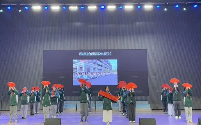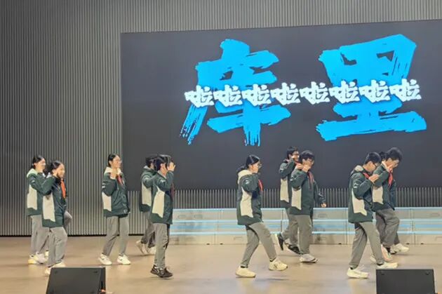为贴合主题,八年级各班在曲目选择上兼顾红色经典与时代新声,既有《卢沟谣》这类承载着历史记忆、传递革命精神的红色曲目,也有《如愿》等抒发家国情怀、契合当代青年使命的时代歌曲。在演唱形式上,各班更是别出心裁,纷纷融入舞蹈、朗诵等创意编排,将歌曲的情感内核与班级的精神风貌深度结合。