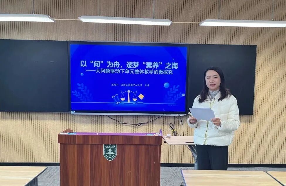 随后,固城中心小学李芳老师作了题为《从"问题"到"素养":大问题驱动下新教材整体教学的实践路径与案例分析》的专题讲座。李老师从理论分析、设计原则、课例解读三个方面展开讲座,结合三节课例细致分析,阐释如何在Big question的驱动下展开单元整体教学。