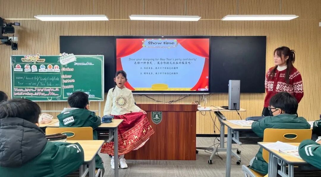 第三节课由汶溪小学的荀海云老师执教。荀老师以自己的special day导入,创设真实语境:为即将到来的新年设计新年服饰,让学生在有趣的课堂设计中复现、整合、内化、输出语言,并进一步落实到仿写,形成了教学评一体化的闭环。
