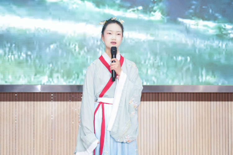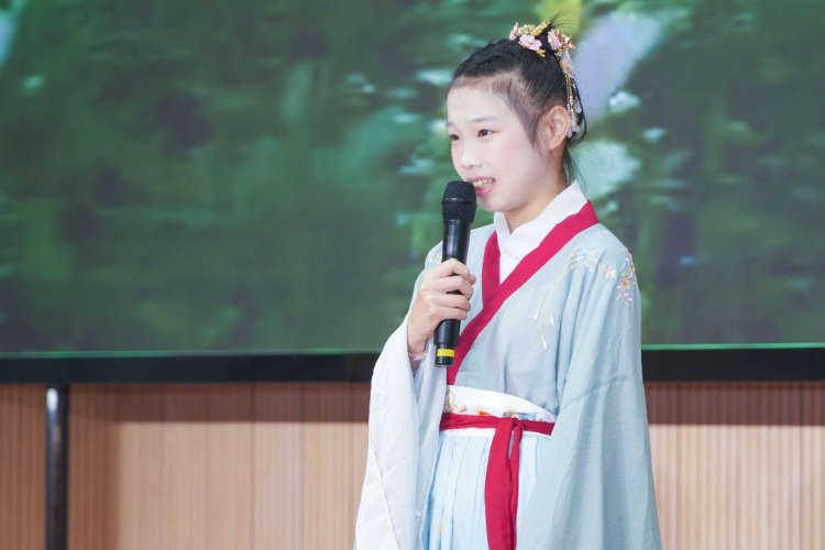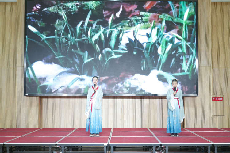 初一(1)班的同学们身着素雅汉服,声情并茂演绎朱自清的《春》,眉眼间漾着笑意,语调轻快明朗,仿佛将草长莺飞、百花争艳的春日画卷铺展在听众眼前。