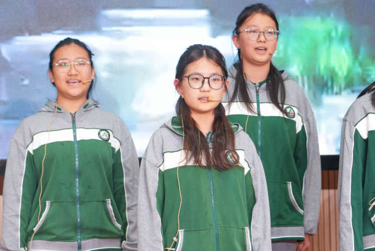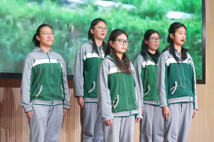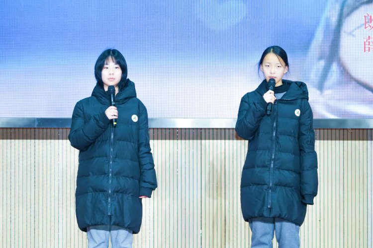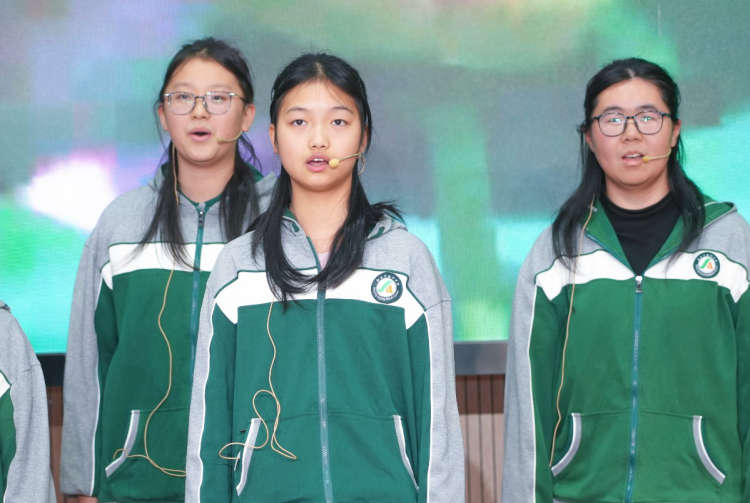 初三(1)班将观众引入穆旦《我看》的诗意世界,她们以舒缓而深沉的声音,让春风、青草与天空的意象在诵读中徐徐展开,以声音为笔,绘出一幅生命向自然舒展的静谧图景。
