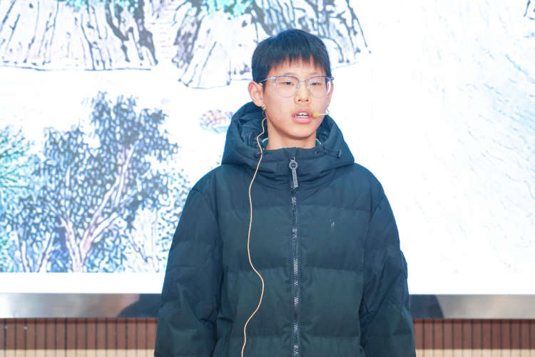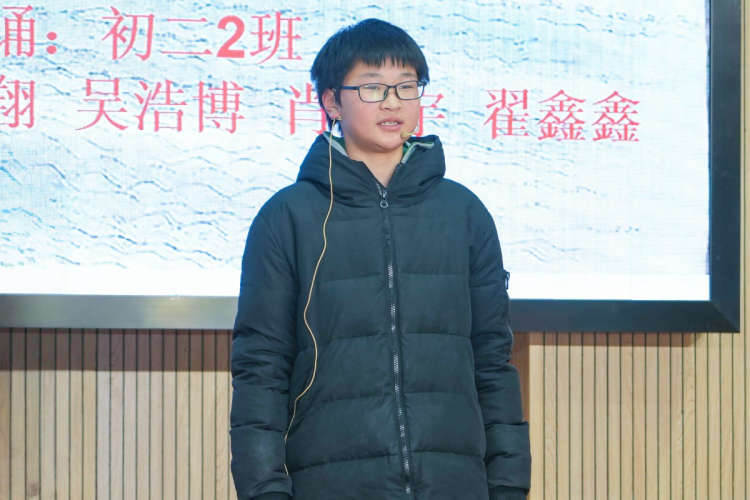 初二(2)班则将目光投向山水之境,借郦道元《三峡》铺展出一幅流动的画卷——语调时而高亢,如两岸连山拔地而起;时而婉转,似江水奔涌曲折迂回;最终归于一片清澈的宁静,引领听者走入心灵的平静与安然。