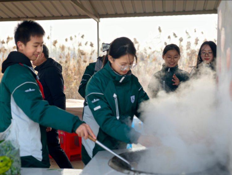 经过一番忙碌,一道道带着浓郁锅气的菜肴终于出锅啦!金黄酥脆的土豆丝、鲜香入味的凉拌鸡爪,清脆可口的爆炒青菜……摆上简易的长桌,大家围坐在一起,你一筷我一勺,分享亲手制作的美食。聊聊炒菜时的小趣事,有的人烧火时不小心蹭到了灰,变成了“小花猫”;有的人切菜时不小心切到了手......看看身旁摇曳的芦苇,吹吹秋日的晚风,这份由劳动换来的美味,比任何大餐都香甜。
