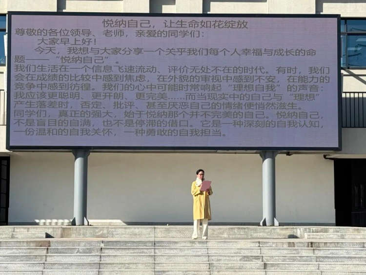 2025年12月15日的升旗仪式上,专职心理老师杨福佳老师为全校师生带来一场题为《悦纳自己,让生命如花绽放》的国旗下讲话。这是一个关乎每个人幸福与成长的命题。在成长旅程中,外界的标准、他人的评价、自我的期许,如同无形的尺,时刻在丈量着每个人。悦纳自己,就是认知上的“看见”与“理解”,是情感上的“接纳”与“关怀”,更是行动上的“立足”与“创造”。