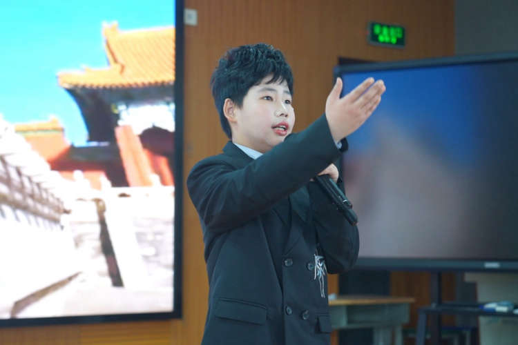 四(1)班过欣宸同学倾情演绎《发如雪》,唱腔婉转悠扬,将古典诗词的雅致与优美融入歌声,更让雪落长街、月照千年的诗意随旋律静静流淌在舞台之上。