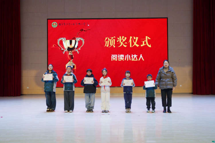 夏露露主任为各年级 “阅读小达人” 代表颁奖,表彰他们在书海中的不懈探索。石梦静副主任为阅读展演中表现突出的 “最佳小主持奖” 获得者颁奖,肯定他们在舞台上的自信风采。言克琴主任为380组 “书香家庭” 代表颁奖,见证家校携手共育的丰硕成果。施丽副校长为 “阅读展演优秀组织班级” 颁奖,表彰班级在活动中的团结协作与精心筹备。周晓主任为 2025 年江宁区关工委读书征文一等奖获得者颁奖,鼓励同学们以笔为媒,抒发心声。
